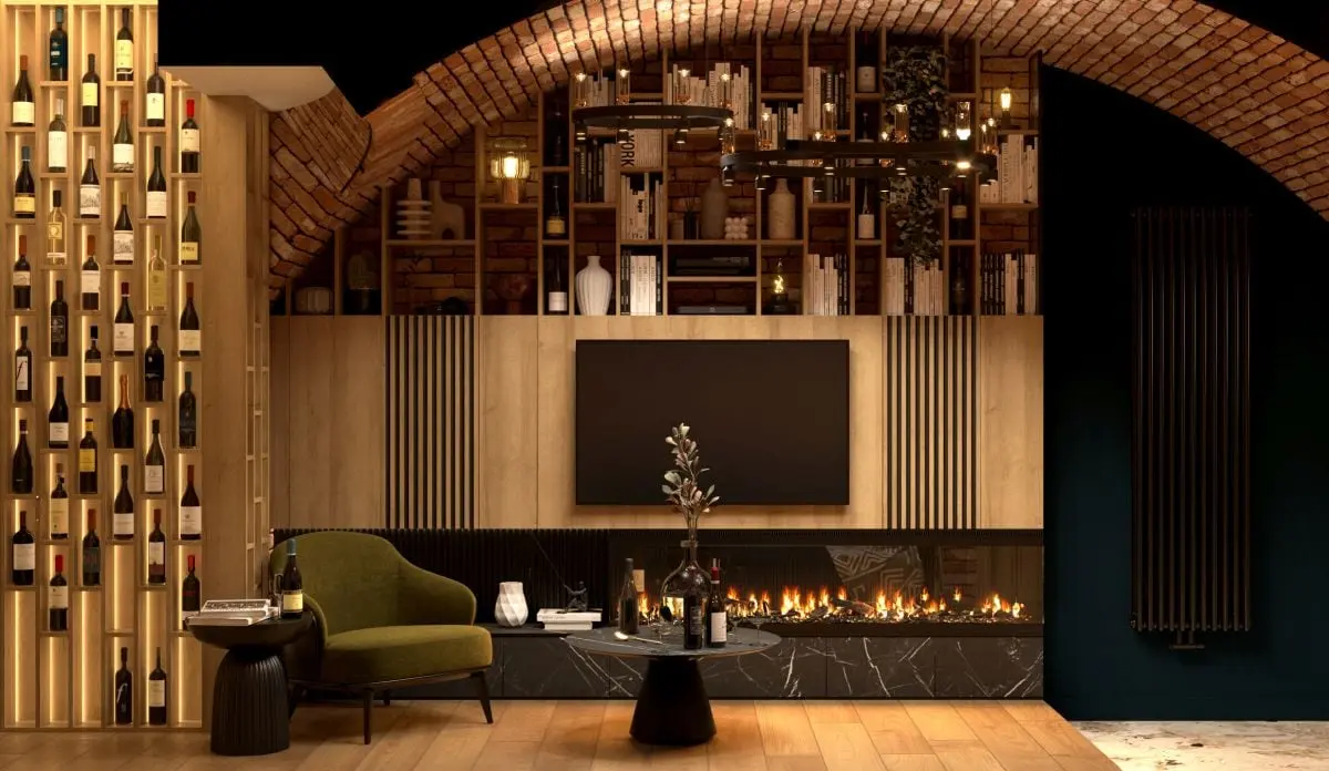 Choć trudno tu wskazać na jeden dominujący styl, wnętrza są spójne stylistycznie, a ich wystrój ściśle podporządkowany funkcji. Pokój z winem łączy elementy nowoczesne (kamień, biokominek w zabudowie TV) ze stylem loftowym (stara cegła, industrialne oświetlenie, czerń), a całość dopełniają drewniane, półki na wino. Klimat budują nie tylko materiały i wyposażenie, takie jak stylowa sofa Jenny od Sits, ale też ceglane łuki, które postanowiono wykorzystać do podkreślenia aranżacji. To miejsce bardzo kameralne, sprzyjające spędzaniu czasu z lampką wina w dłoni.