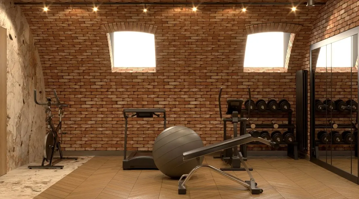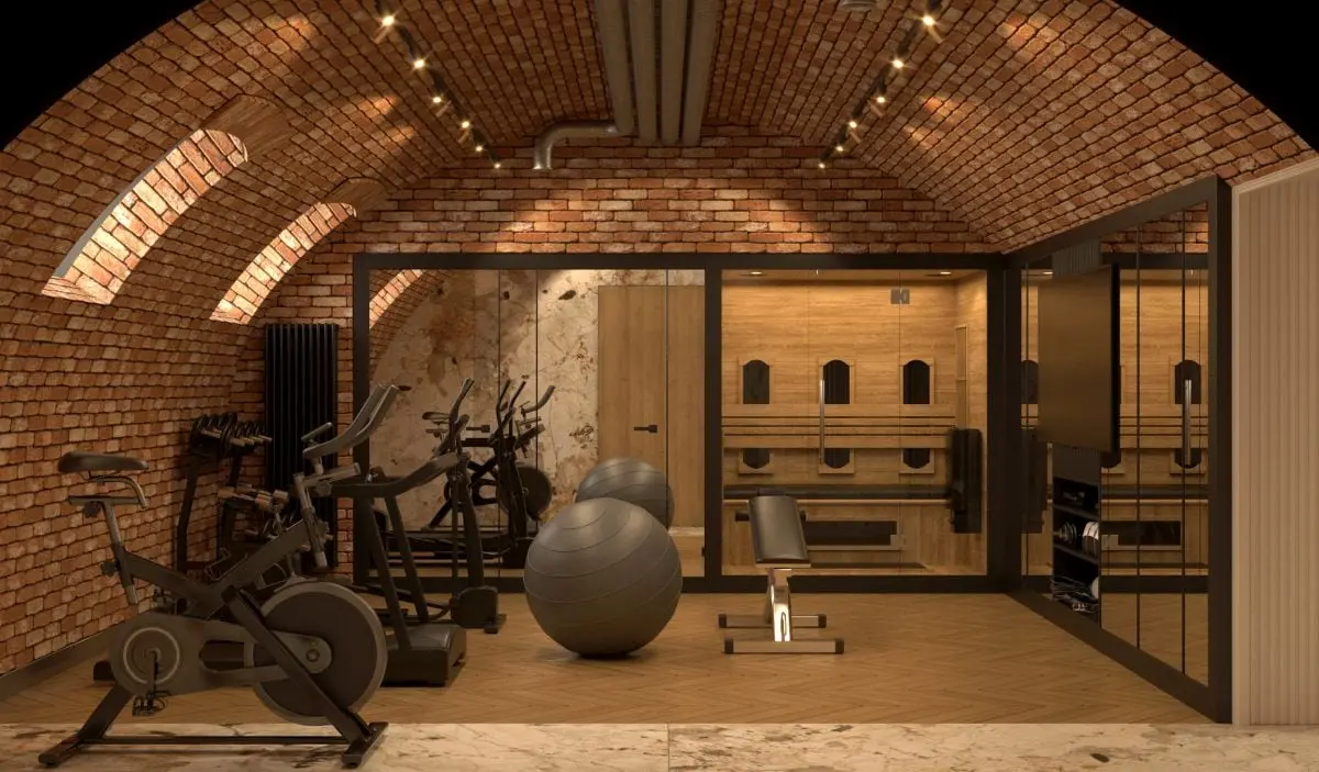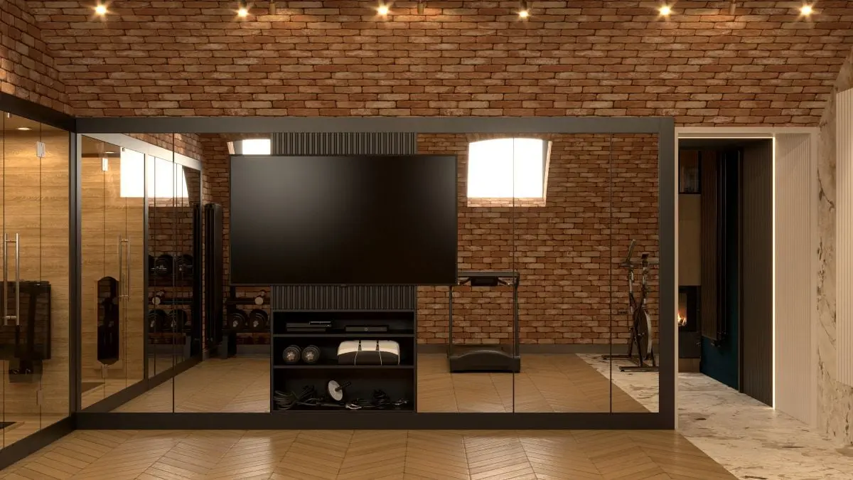 Równie eklektyczny charakter, jak dwa pozostałe pomieszczenia, ma dobrze wyposażona siłownia. Loftowa cegła stanowi tło dla starannie dobranych sprzętów do ćwiczeń. Jej surowy charakter przełamuje rysunek kamienia położonego na ścianie z wejściem do pomieszczenia. Kontrolę nad treningiem zapewniają duże tafle luster ubrane w czarne, industrialne ramy, w które wbudowano… telewizor. Siłownia to bowiem nie tylko miejsce pracy fizycznej nad własnym ciałem, ale też relaksu. Podkreśla to ukryta za szklanymi drzwiami sauna. Zabudowana w drewnie, zapewnia spójność aranżacji wszystkich pomieszczeń, cechującą najlepsze projekty wnętrz.
