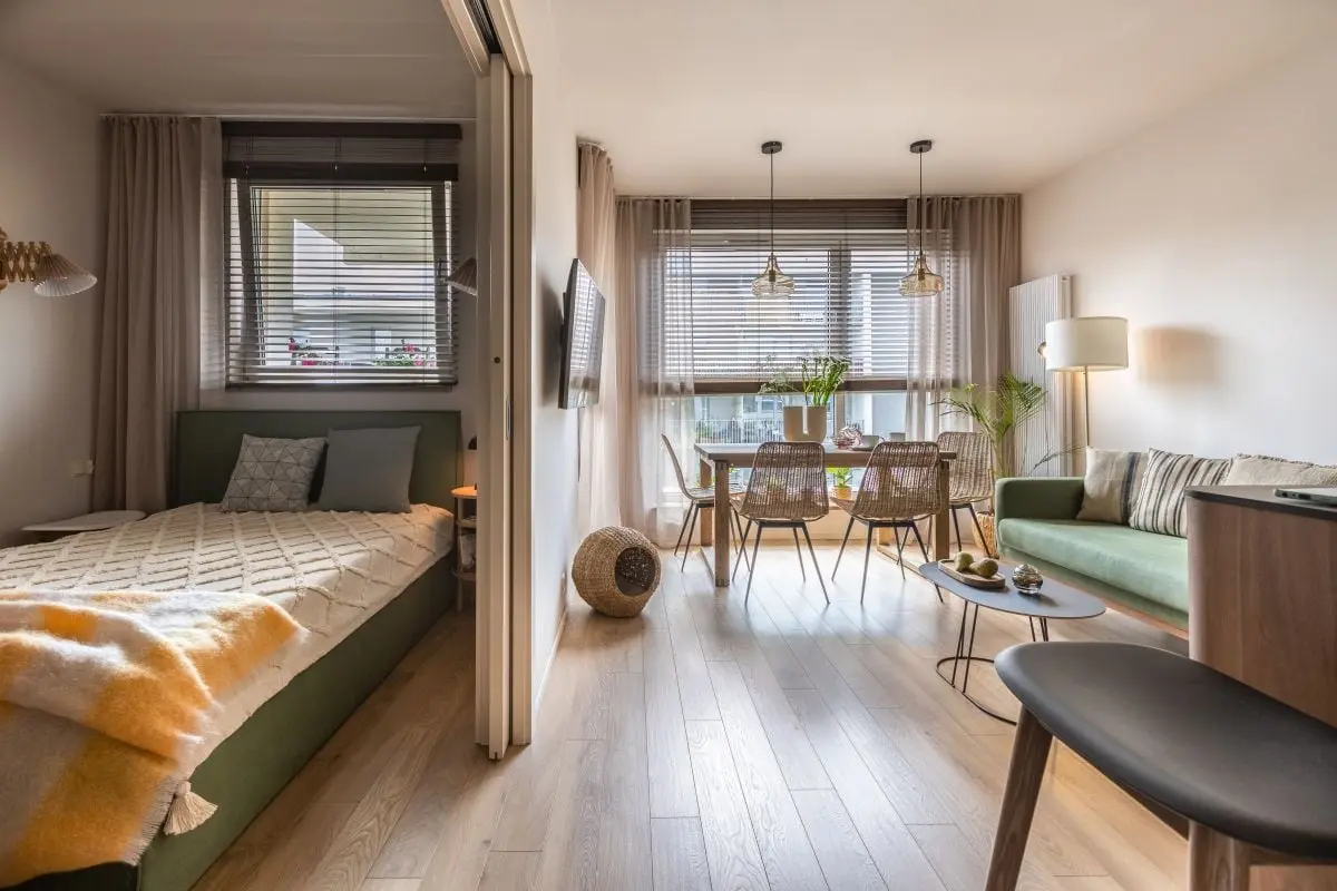 Mobilność elementów wyposażenia i ich podwójne funkcje, podyktowane zostały potrzebą maksymalnego wykorzystania dostępnej przestrzeni. Przekładają się one jednak także na wystrój wnętrz. W aranżacji przenikają się dwie płaszczyzny tekstur – kolor i drewno. Także wykończenia drewniane powtarzają tę zasadę binarności. Na podłodze odnajdziemy bowiem dąb, a na meblach – orzech. Ten ostatni połączony jest z ciepłym beżem, który powtórzono w stolarce drzwiowej i listwach przypodłogowych. W to zestawienie kolorystyczne doskonale wpisują się płytki z rysunkiem kamienia, które wprowadzone zostały do łazienek oraz powtórzone na ścianie nad blatem w kuchni. W części dziennej do kolorów natury dołączyła przygaszona zieleń tapicerki sofy (którą odnajdziemy także w sypialni, gdzie króluje zielone tapicerowane łoże). Ciepły nastrój dopełniają firanki z naturalnego materiału oraz rattanowe elementy – krzesła, donica i oczywiście legowisko dla kota. Wszystko bowiem jest tu dokładnie przemyślane, nie tylko pod względem funkcji, ale też estetyki.