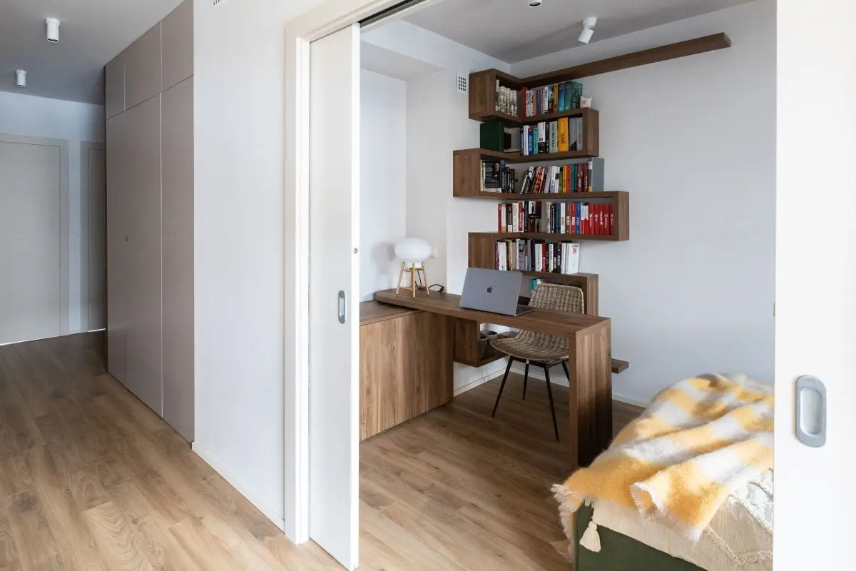 Dzięki szczegółowo, co do centymetra, przemyślanemu rozplanowaniu przestrzeni zyskaliśmy nie tylko dodatkowy pokój, ale też np. przestrzeń do pracy z biblioteczką i miejsce do gry na gitarze w nowej, powstałej w miejsce kuchni, sypialni. Wymagało to jednak wielu kompromisów aranżacyjnych i sprytnych rozwiązań. I tak, by powiększyć przestrzeń raczej ciasnego salonu, wybrałam drzwi dwuskrzydłowe przesuwne między sypialnią a pokojem dziennym.