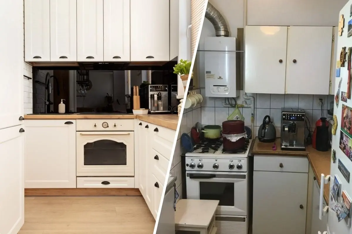 Kuchnia po remoncie jest nie do poznania. Chociaż nadal jest mała, zrobiło się tu przestronniej. Duża ilość szafek sprawiła, że możemy ukryć większość sprzętów a blat roboczy pozostaje do dyspozycji gotującego. Tym samym łatwiej utrzymać porządek i jest bardziej funkcjonalnie.