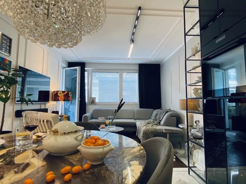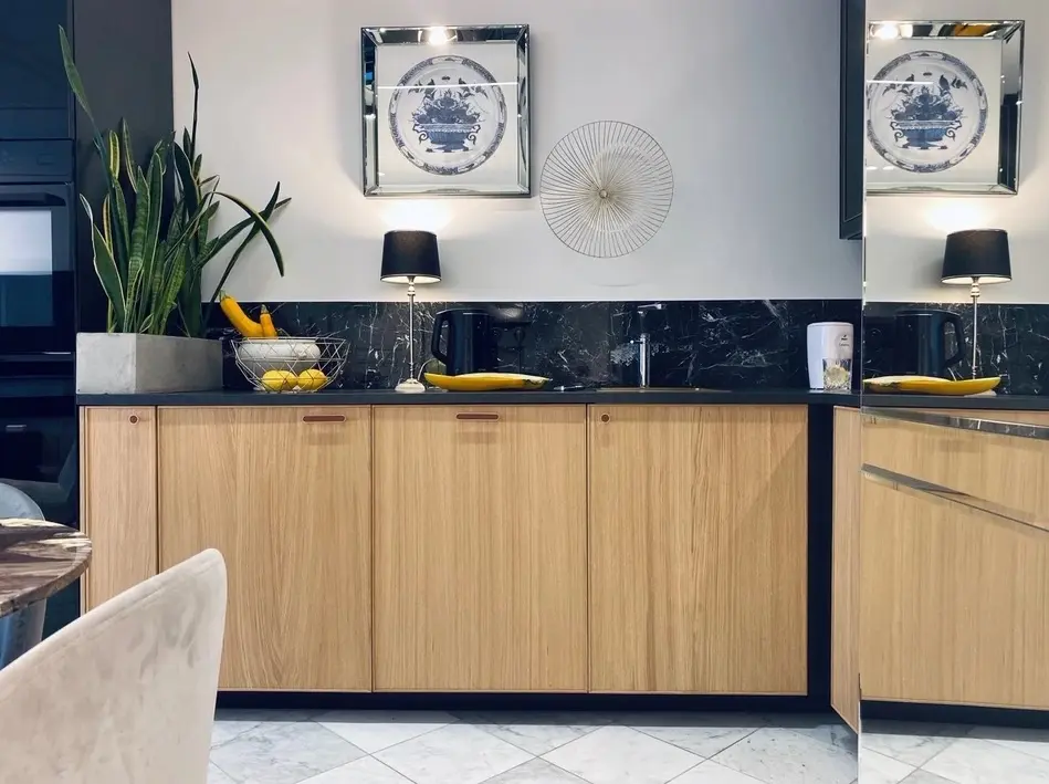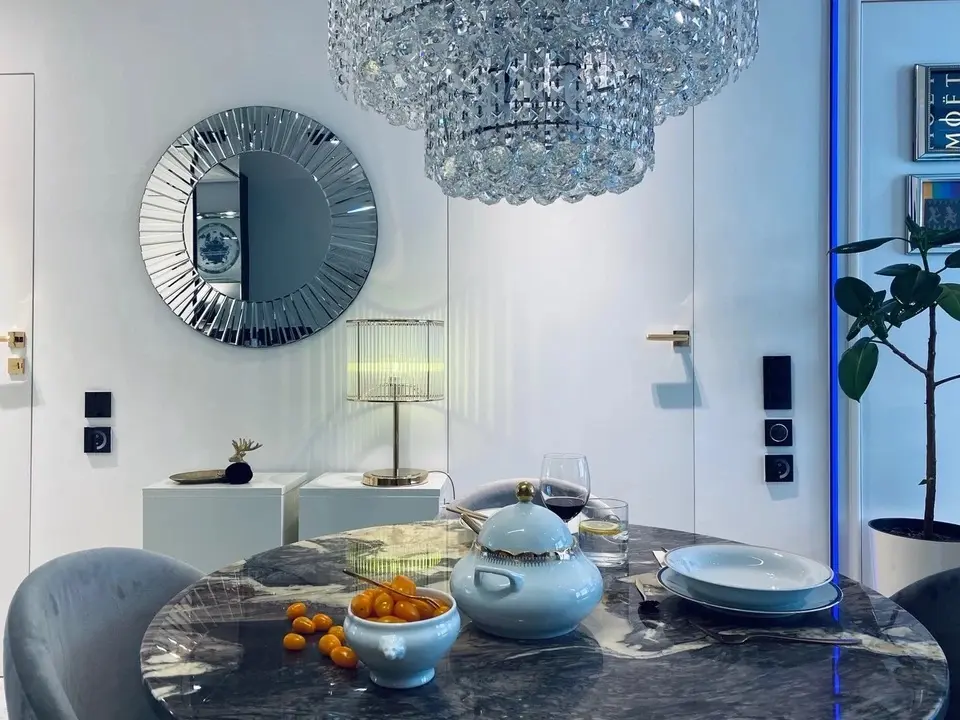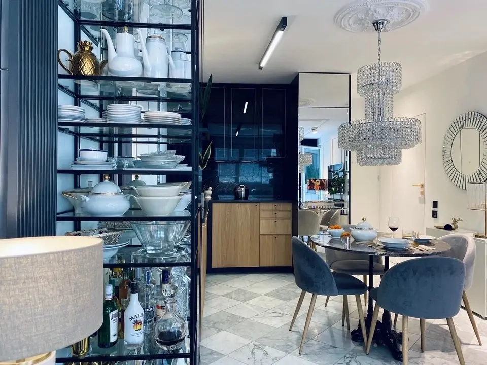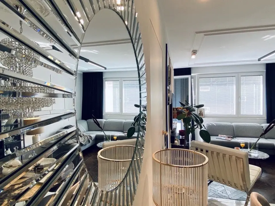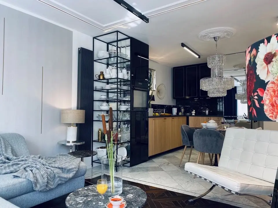 Mieszkanie znajduje się w bloku i zostało urządzone w ciekawy i intrygujący sposób. Znajdują się tu elementy dekoracyjne z targów staroci, znaleźć można akcenty nowojorskiego stylu. Na ścianach i suficie mamy sztukaterię, nawiązanie do klasycznego stylu. Materiały zostały wybrane dobrej i szlachetnej jakości jak marmur, drewno, miękkie tkaniny, a w łazience złota armatura.