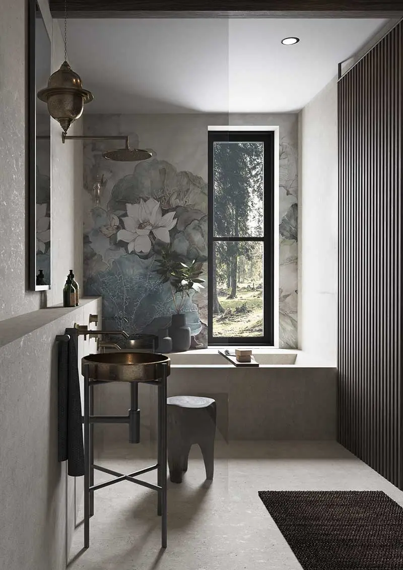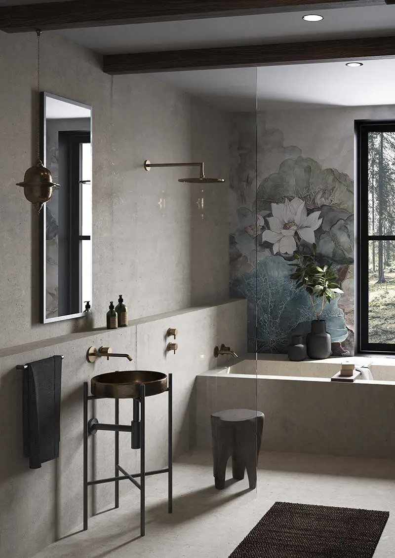 Surowość a jednocześnie nostalgia i elegancja została zawarta w tym bardzo oryginalnym projekcie łazienki. Nietuzinkowa i nieszablonowa dla osób ceniących sobie dobry design. Architekta Małgorzata Niedzielska postawiła na połączenie klasycznej szarości ze złotymi, lekko postarzanymi bateriami oraz bardzo ciekawą umywalką stojącą na mosiężnych, delikatnych nóżkach. Nowatorskim rozwiązaniem jest zainstalowanie prysznica zaraz obok wanny. Na ścianie nad wanną, tuż obok obłędnego widoku na las, znajduję się nasza ulubiona tapeta Wall and Deco seria Niveum. przeznaczona do stosowania we wnętrzach narażonych na wilgoć.