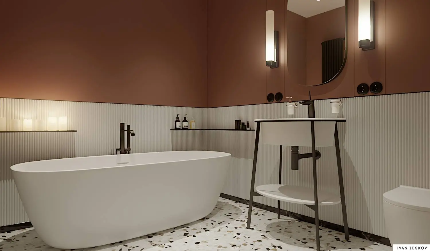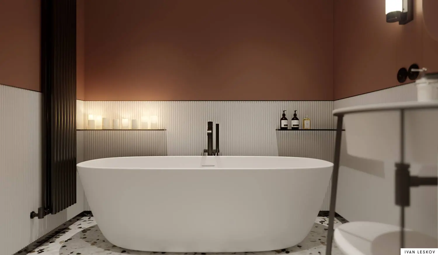 Różnorodne wzory, tłoczenia i kolory – kafelki to pierwsze, co rzuca się w oczy po wejściu do łazienki. To właśnie one w dużej mierze definiują styl naszego wnętrza, pokrywając jego ściany i podłogę. Łazienka na pierwszy rzut oka minimalistyczna, ale jej odbiór jest ciepły poprzez wybranie karmelowego koloru na ściany oraz dobranie znakomitej podłogi lastryko. Mistrz eleganckiego i wyszukanego minimalizmu architekt Ivan Leskov.