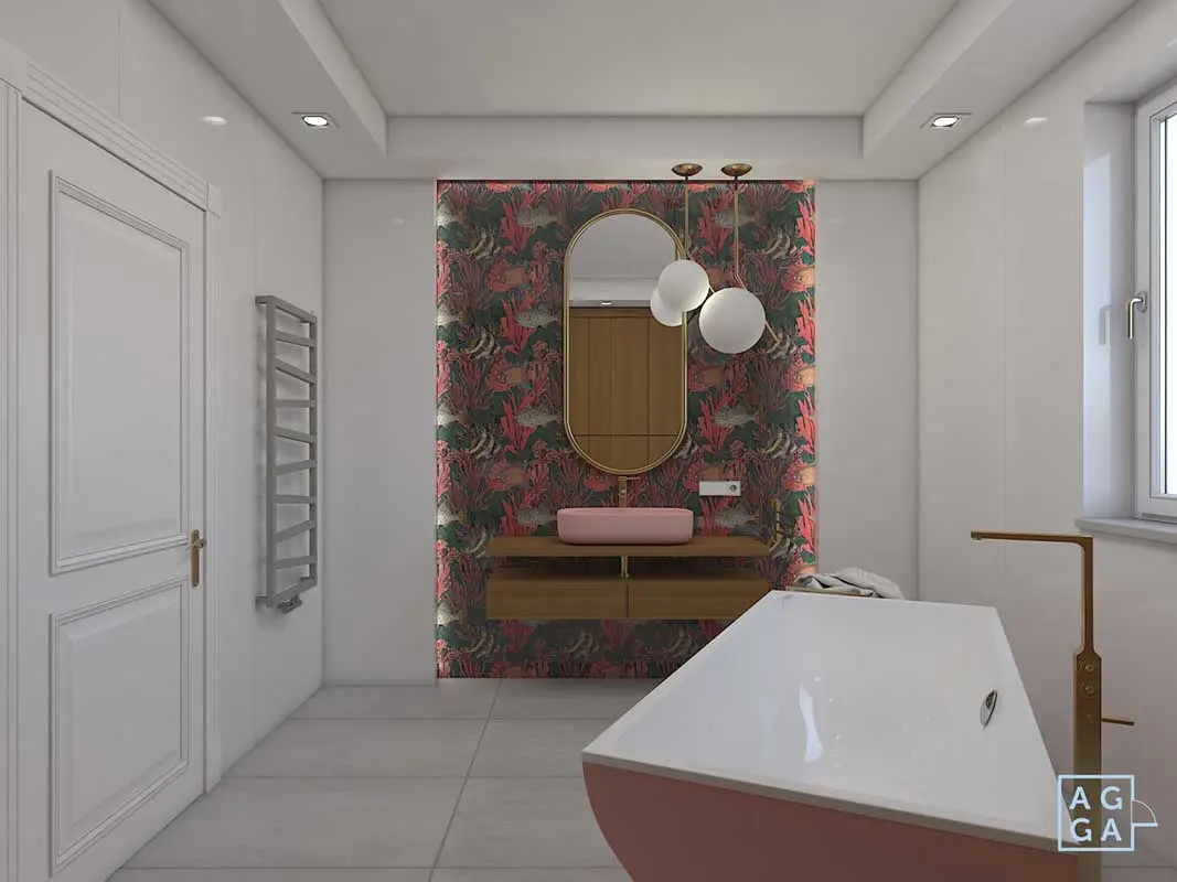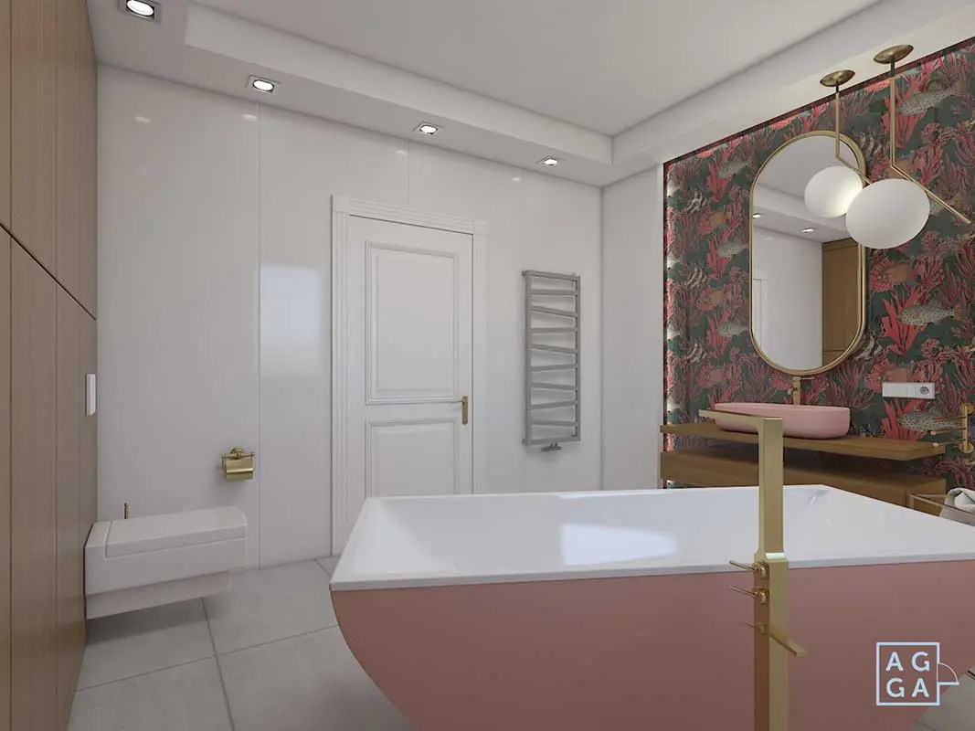 Kolor roku 2019 Living Coral i wzór na ścianie w towarzystwie kolorowej różowej ceramiki dopełnia przepiękna złota armatura. Łazienka niezwykle elegancka i funkcjonalna zaprojektowana przez architekt Agnieszka Gajkowska.