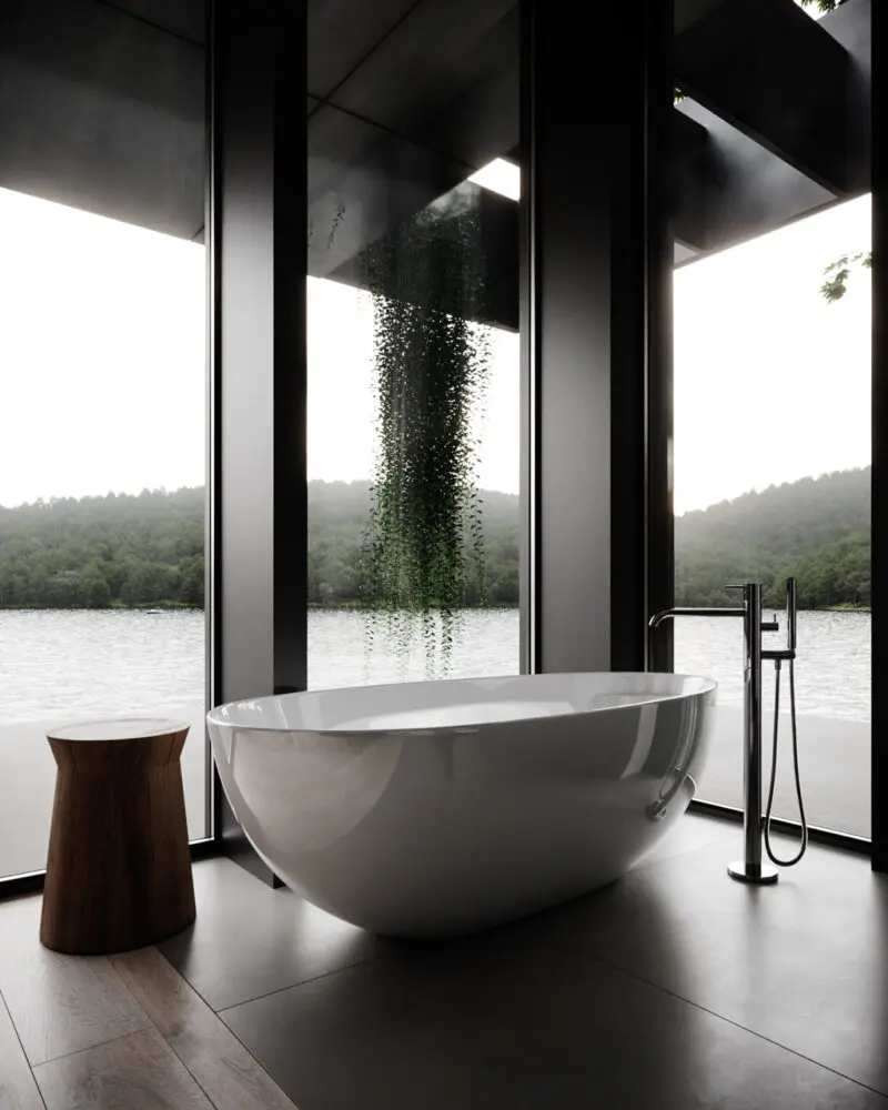 W aranżacji organicznej wanna pełni funkcję nie tylko użytkową, lecz także symboliczną – przywołuje skojarzenia ze zbiornikiem wodnym, naturalnym źródłem odprężenia. Modele wolnostojące o miękkiej linii i matowym wykończeniu harmonizują z organiczną estetyką, szczególnie w zestawieniu z bateriami podłogowymi o wachlarzowym strumieniu. Tego typu rozwiązanie nie tylko podkreśla formę, ale też wzmacnia zmysłowy aspekt kąpieli, wpisując się w ideę domowego rytuału wellness.
