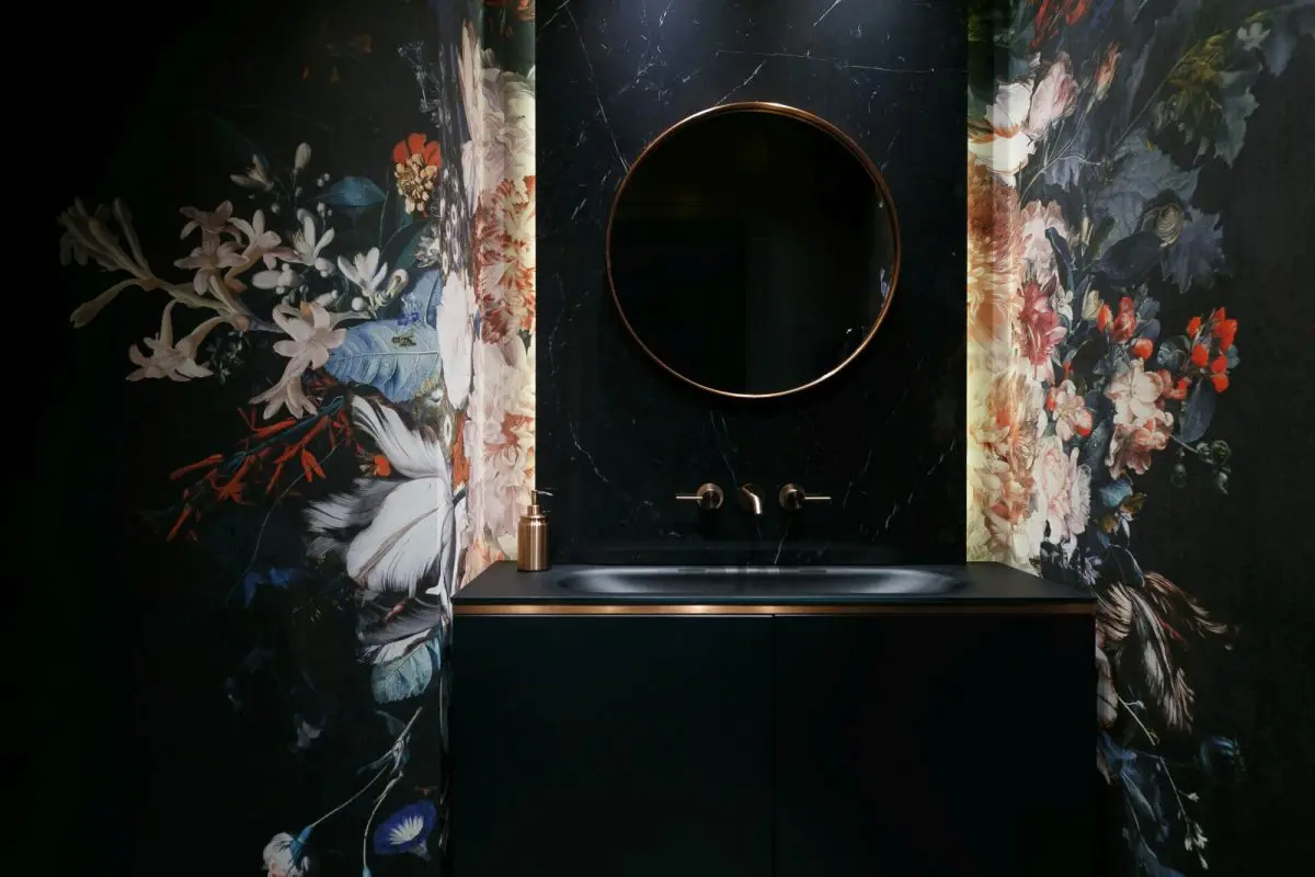 Na tym samym poziomie znajduje się również pomieszczenie socjalne z komfortową kuchnią oraz elegancką łazienką. Uwagę przyciągają tu elementy miedziane: armatura z kolekcji marki Gessi, okrągłe lustro wykończone miedzianą ramką, czy ozdobny detal szafki pod szklaną, robioną na wymiar umywalką. Tłem dla mebli i urządzeń jest wielkoformatowy gres oraz kolejna autorska tapeta, będąca przetworzeniem kilku dzieł mistrzów flamandzkich.