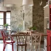 Wnętrza inspirowane estetyką cottagecore cechuje rustykalna stylistyka, która nawiązuje do uroku angielskiej wsi. Głównym założeniem jest stworzenie sielankowej i przytulnej atmosfery, charakterystycznej dla tradycyjnych brytyjskich cottage houses. Kluczową rolę odgrywa tutaj harmonijna, pogodna kolorystyka, w której dominują odcienie błękitu, żółci i czerwieni. Wzory, takie jak pasy, kratki i motywy kwiatowe, są chętnie zestawiane ze sobą, tworząc warstwowe, bogate w detale kompozycje.