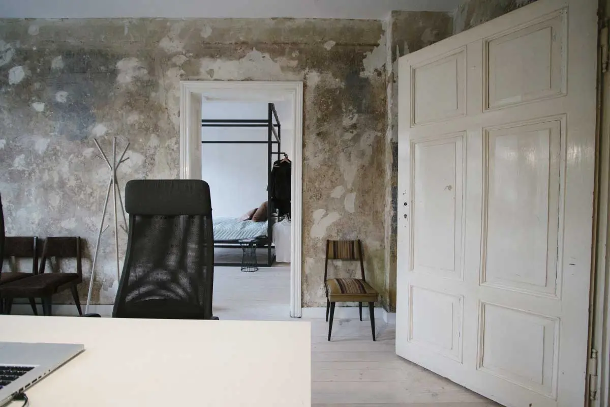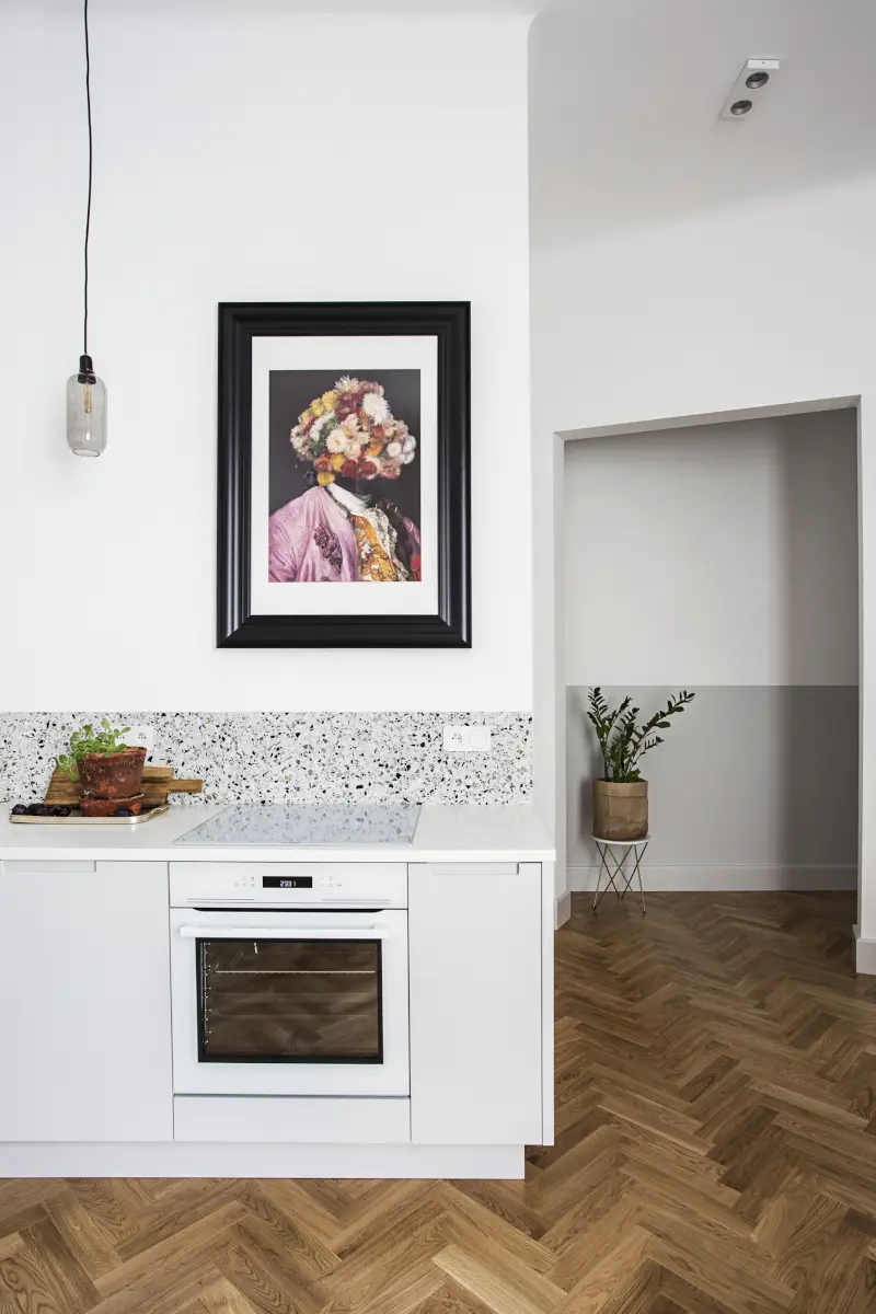 Surowa ściana przestała być domeną stylu industrialnego, gdzie wykorzystywana była jako element spójnej aranżacji. Obecnie „obnażony” tynk wykorzystuje się jako kontrast we wnętrzach eklektycznych, tło dla stylistyki shabby chic, lub jako ciekawy akcent dekoracyjny minimalistycznych pomieszczeń. Właśnie ten ostatni zabieg został wykorzystany w realizacji mieszkania autorstwa studia Archiwisła, gdzie ascetyczna, biała aranżacja została ocieplona drewnianą jodełką oraz ścianą imitującą zniszczoną powierzchnię z wieloma warstwami różnokolorowej farby. Podobna dekoracja znajduje się w korytarzu, gdzie ściana zestawiona jest z marmurową podłogą.