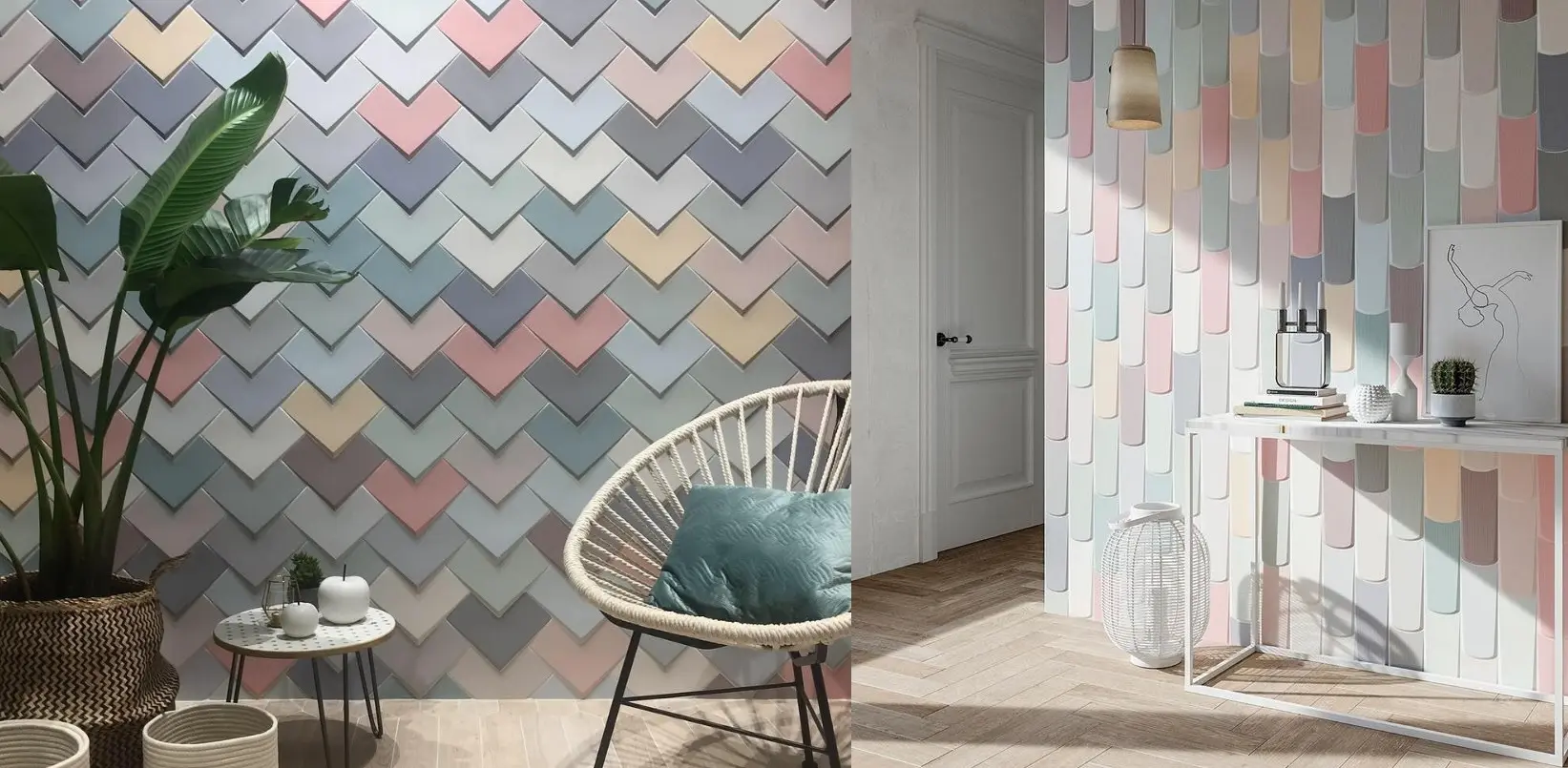 Pomysłowa ściana w przedpokoju. Kolorowa i nieoczywista, niesamowite płytki Boho od hiszpańskiego porducenta Wow Design. Płytki dostępne w pastelowcyh kolorach łagodnie zaokrąglone lub zakończone w trójkąt.