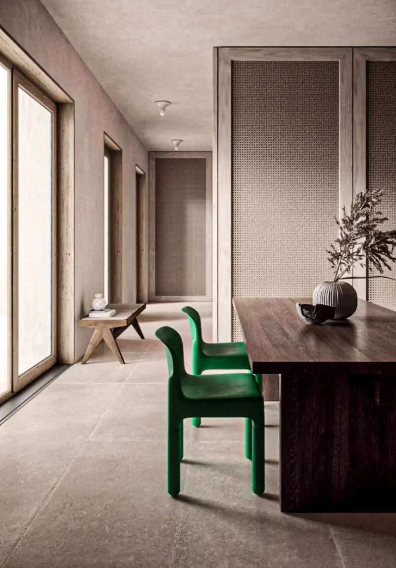 Pojawienie się odcienia Gen Z green, można odczytywać jako ugruntowanie i tak już silnej, pozycji zieleni we wnętrzach. W tym miejscu warto, również przywołać dobrze zapowiadający się Neo mint, który był kandydatem na kolor roku 2020. Barwa ta, podobnie jak Gen Z green, swoje korzenie ma zarówno w naturze, jak i rzeczywistości cyfrowej. Jednak świat wnętrz, nieco wolniej, niż branża modowa, wciela trendy kolorystyczne. Proces produkcji oraz przekonanie inwestorów do nowych rozwiązań wymaga czasu. Natomiast wiele brandów zauważyło potencjał Gen Z green. Jest to miedzy innymi włoska marka 41zero42, specjalizująca się w bardzo oryginalnych projektach płytek ceramicznych. Designerzy związani z firmą, przedstawili w najnowszych kolekcjach swoje pomysły na zastosowanie soczystej zieleni w aranżacji wnętrz. Widać w nich silny wpływ futurystycznej estetyki, jak i tej osadzonej w dominujących trendach. Odważni inwestorzy chętnie przyjmą zielone total looki w odcieniu Gen Z green, która świetnie łączy się z soczystym pomarańczowym. Zwolennicy łagodnych aranżacji w tonacji ziemi, również mogą zaprosić zieleń do swoich wnętrz. Sprawdzi się pod postacią dodatków tj.: krzesła, fotel czy tekstylia.