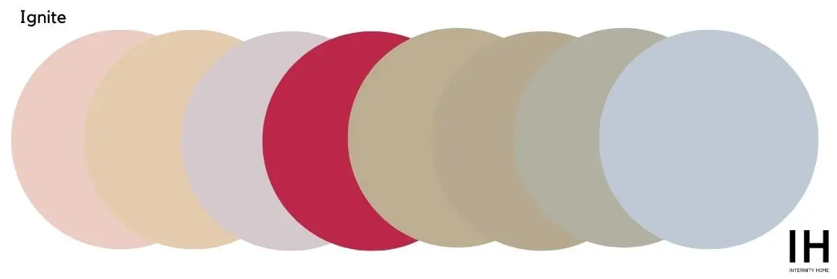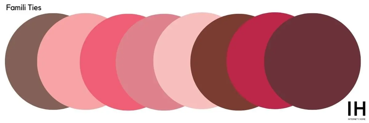 Paleta Famili Ties prezentuje rodzinę barw Viva magenta, umieszczając kolor roku 2023 w chromatycznym zakresie podobnych niuansów. Wszystkie barwy palety osadzone są w różowej tonacji z elementami brązów (o rózowym podtonie). Ostatnia paleta – Ignite, dosłownie rozświetla serce zestawiania, którym jest Viva Magenta. Pastelowe zestawienie otwiera pudrowy róż, a kończy szaro-niebieski błekit. Znajdziemy tu też neutrale w postaci khaki.