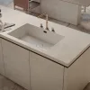 W kuchni płytki wielkoformatowe można zastosować nie tylko na ścianie nad blatem. Robi się z nich bardzo trwałe blaty, szafki kuchenne, stoły, wyspy czy półwyspy. Przestrzeń jest wtedy jednolita i harmonijna. Wystarczy zlew czy płytę kuchenną wbudować w płytkę wielkoformatową by uzyskać gładką, estetyczną powierzchnię. Także znakomicie sprawdzą się na podłodze w kuchni.
