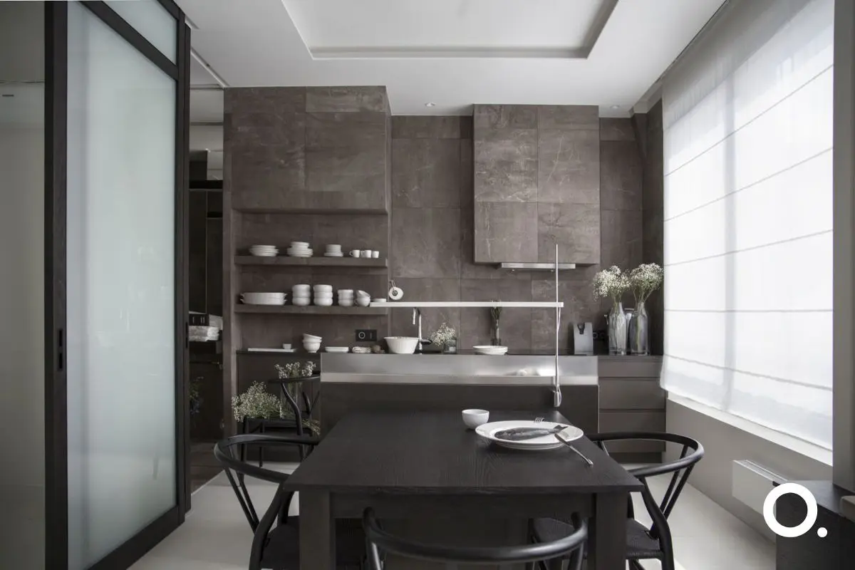 Salon jest utrzymany w jasnych kolach. Panuje tu oszczędny minimalizm, którego jednak nie odarto z przytulności. Kuchnia w tym projekcie jest dominująca. Królują tu ciemne kolory, a mocny i zarazem drapieżny efekt potęgują wykorzystane płytki Marazzi Blend Brown (możesz je zamówić w naszych showroomach).