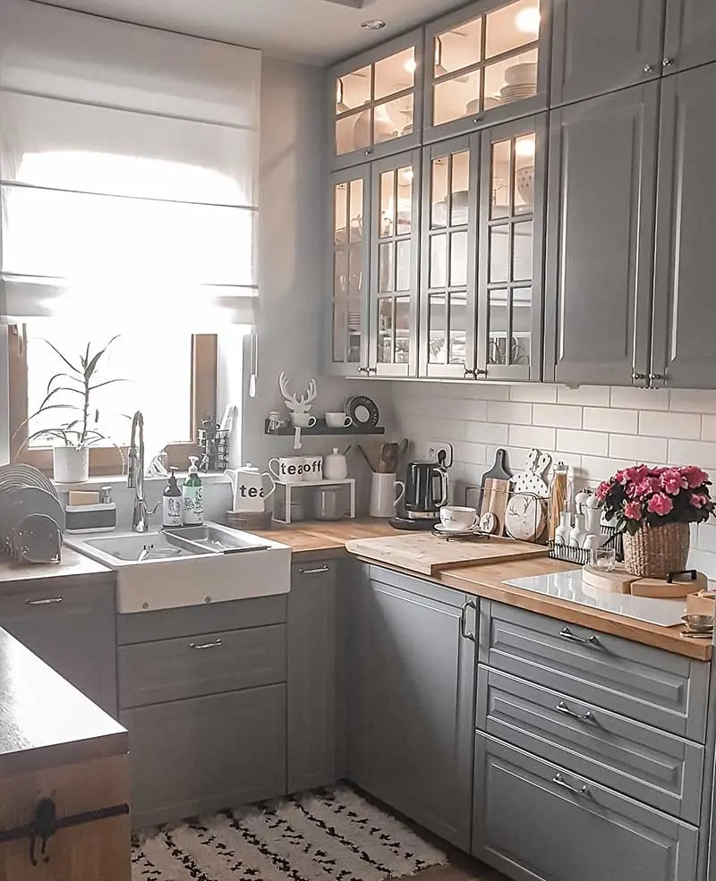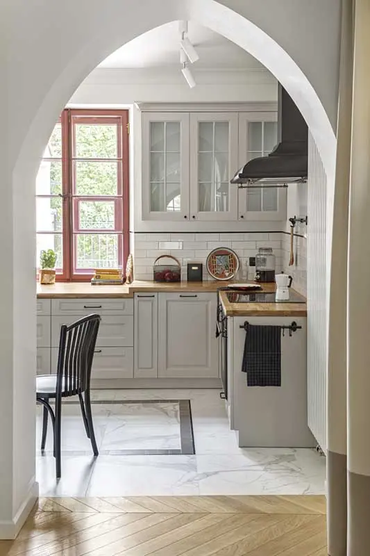 Szara kuchnia w styku klasycznym z drewnianym blatem: