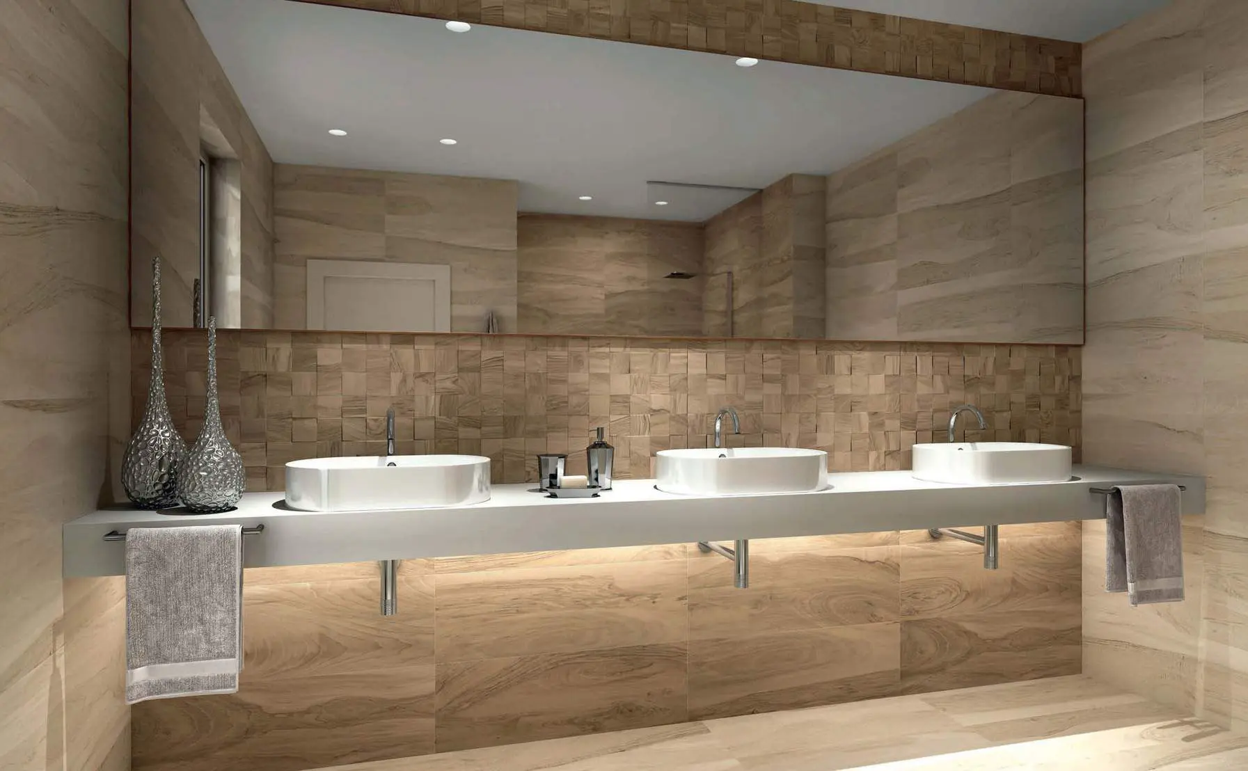 Ściany i podłogi najlepiej wykończyć płytkami w powyższej kolorystyce. Ciekawym pomysłem jest kamienna lub ,,drewniana” ceramika, która zbliża nas do naturalnych rozwiązań obecnych w filozofii hygge.