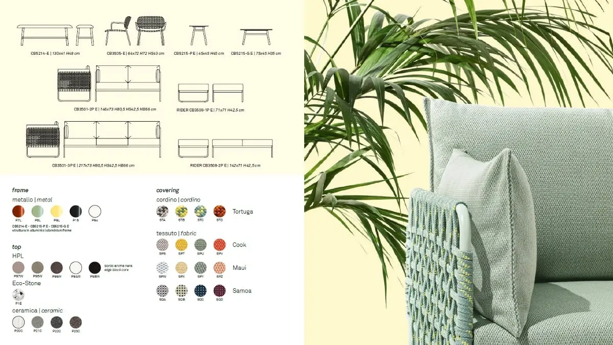 Meble outdoorowe Connubia, zostały pomyślane jako naturalny rozwój istniejącej kolekcji do wnętrz. Projektanci wykorzystali charakterystyczny dla Marki styl oraz paletę kolorów, przenosząc ją na projekty mebli zewnętrznych. Ważne dla koncepcji było dobranie materiałów, które będą wyjątkowo odporne na wszelkie czynniki zewnętrze tj. silne słońce czy deszcz. Ponadto zadbano, by obicia meblowe były odporne na powstawanie pleśni, blaknięcie, a także łatwoczyszczące. Podczas pracy nad kolekcją, jej twórcom towarzyszyła wizja ludzi, który będą spędzać miłe chwile na świeżym powietrzu, korzystając z serii outdoorowej Connubia. Myśleli o rodzinie i przyjaciołach zbierających się przy stole, by spędzać wspólnie czas. Projektanci chcieli umożliwić użytkownikom stworzenie nowej strefy komfortu, bez względu na to, czy będzie to duży ogród, elegancki taras lub mały balkon.