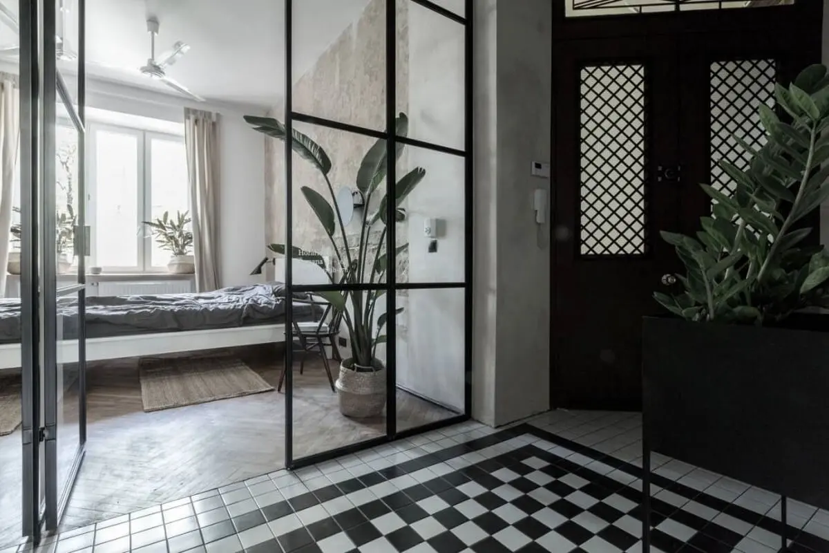 Łódzkie biuro architektoniczne Scadilove to mistrzowie tworzenia niezwykle klimatycznych mieszkań. Jeden z lokali znajdujący się vis-à-vis Muzeum Sztuki, stanowi połączenie skandynawskiego minimalizmu z pochwałą niedoskonałości, która podkreśla historię miejsca. Surowy tynk ściany w sypialni stanowi piękne tło dla prostej aranżacji, opartej na kontraście bieli i czerni, wzbogaconej o beże i naturalną zieleń roślin. Architekci postarali się, by w nowoczesnym wnętrzu obecny był duch czasu.