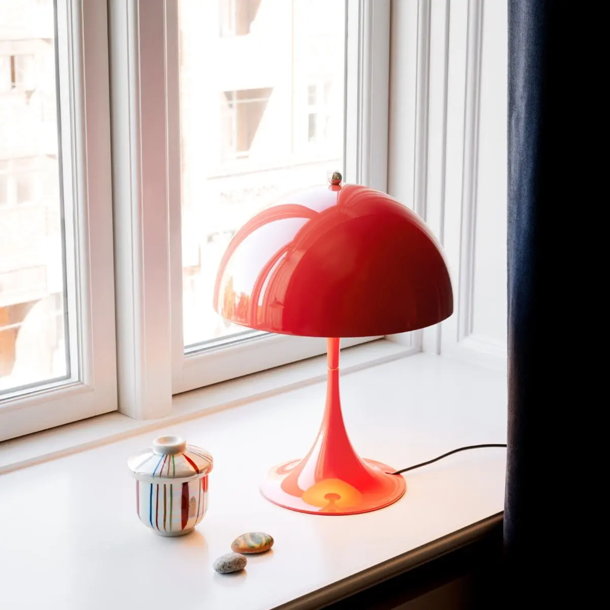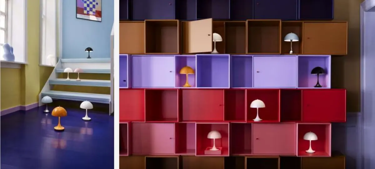 Rodzina lamp Panthella została zaprojektowana tak, aby emitować nieoślepiające, miękkie i komfortowe światło. Metalowy klosz kieruje światło bezpośrednio w dół, jego wnętrze pomalowane na biało rozprasza je, a nóżka w kształcie trąbki sprawia, że promień delikatnie po niej spływa. Model dostępny jest w wersji Table (44x55cm), Mini (25×33,5cm) oraz Portable (16×23,8cm). W najnowszej odsłonie kolorystycznej, Louis Poulsen nawiązał do współczesnych trendów barwnych – pasteli. Model Mini oraz Portable V2 dostępne są w soczystych odcieniach: pudrowego różu, baby blue oraz koralowym. Jak podkreśla brand: