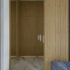 Nowoczesny przedpokój zachwyca od pierwszego kroku połączeniem szlachetnych materiałów. Szklane drzwi w czarnych, metalowych ramach wprowadzają industrialny charakter i optycznie powiększają przestrzeń. Na ścianach zestawiono wielkoformatowe płytki marmurowe z drewnem, którego ciepły odcień oraz pionowe lamele dodają wnętrzu harmonii i elegancji. Marmur pojawia się również na podłodze, tworząc spójny, luksusowy fundament aranżacji. Całość dopełnia nowoczesny obraz, który wnosi artystyczny akcent, podkreślając wysmakowany charakter tego przedpokoju.
