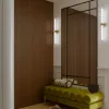 Istotnym elementem projektu jest szałwiowa ściana, w której zaprojektowano ukryte drzwi pokryte tym samym kolorem. Komfort przestrzeni dopełnia owalny puf, nad którym umieszczono lustro odbijające zieleń sąsiadującej ściany.