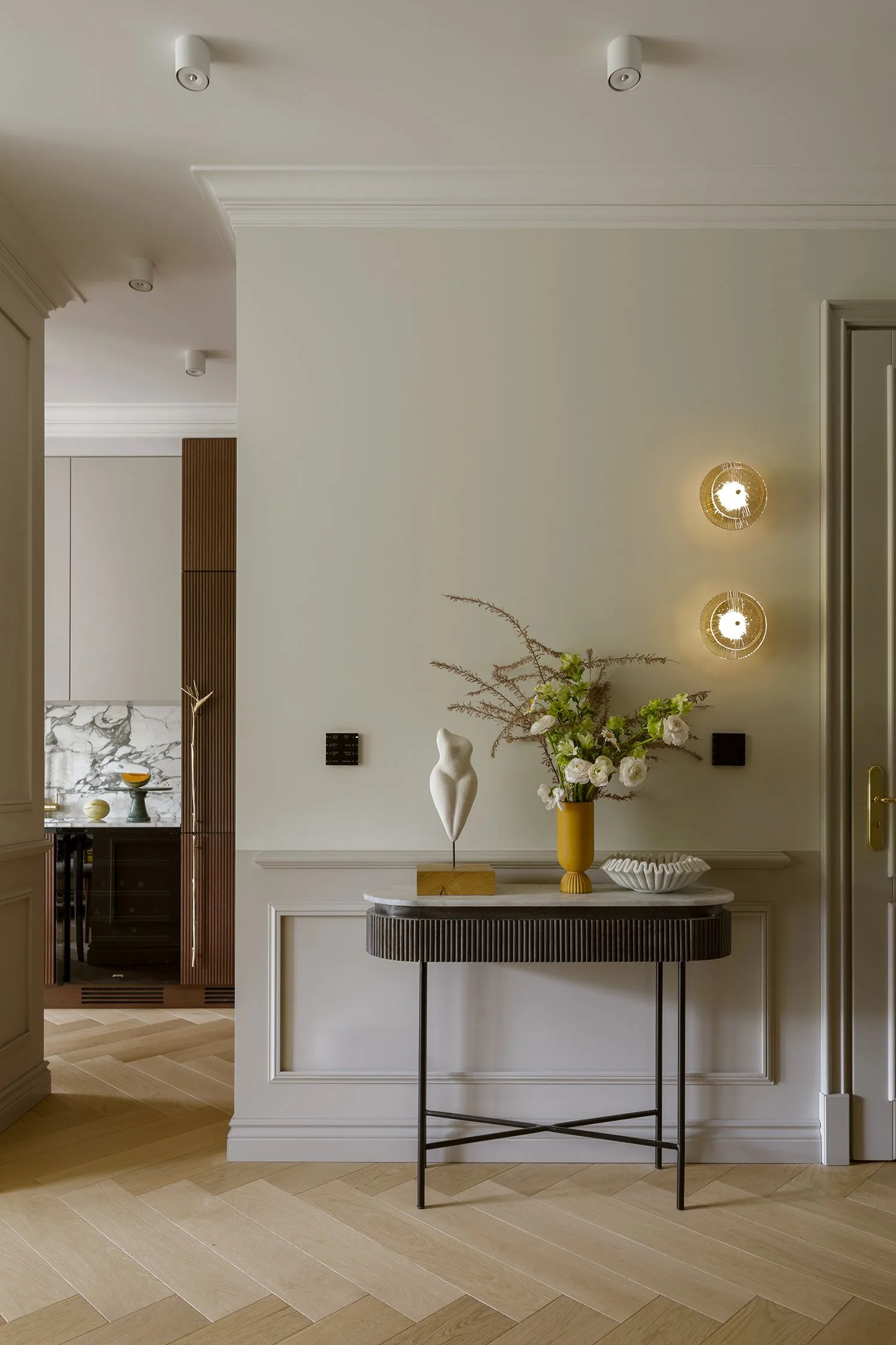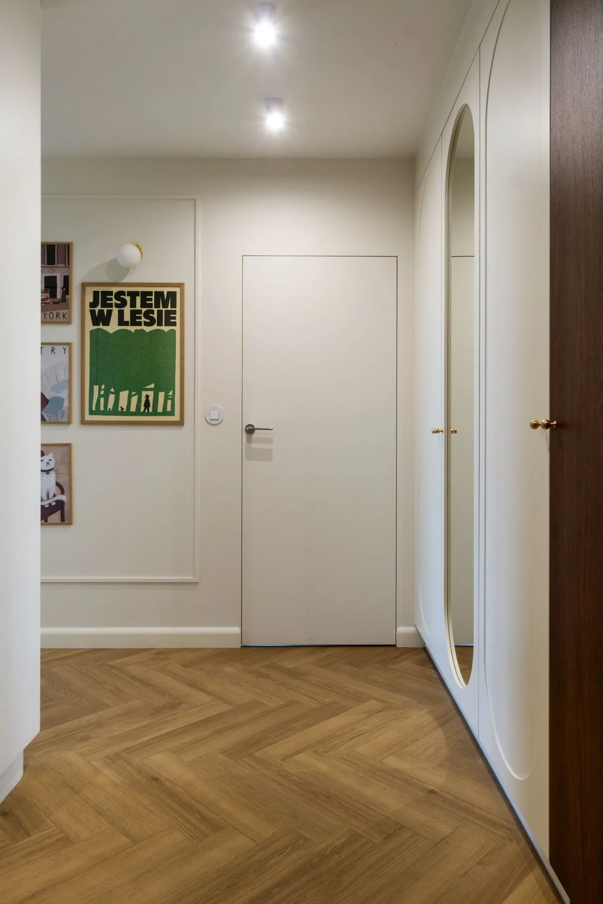 Kolejny projekt przedpokoju udowadnia, że największe znaczenie dla całości mają dopracowane detale. Bazą wnętrza jest ocalona od zapomnienia i odrestaurowana jodełka na podłodze oraz jasne ściany podkreślone prostą sztukaterią. Całość zyskuje ciekawy wygląd dzięki galerii plakatów, a także zabudowie z owalnymi ornamentami oraz lustru o tym samym kształcie.
