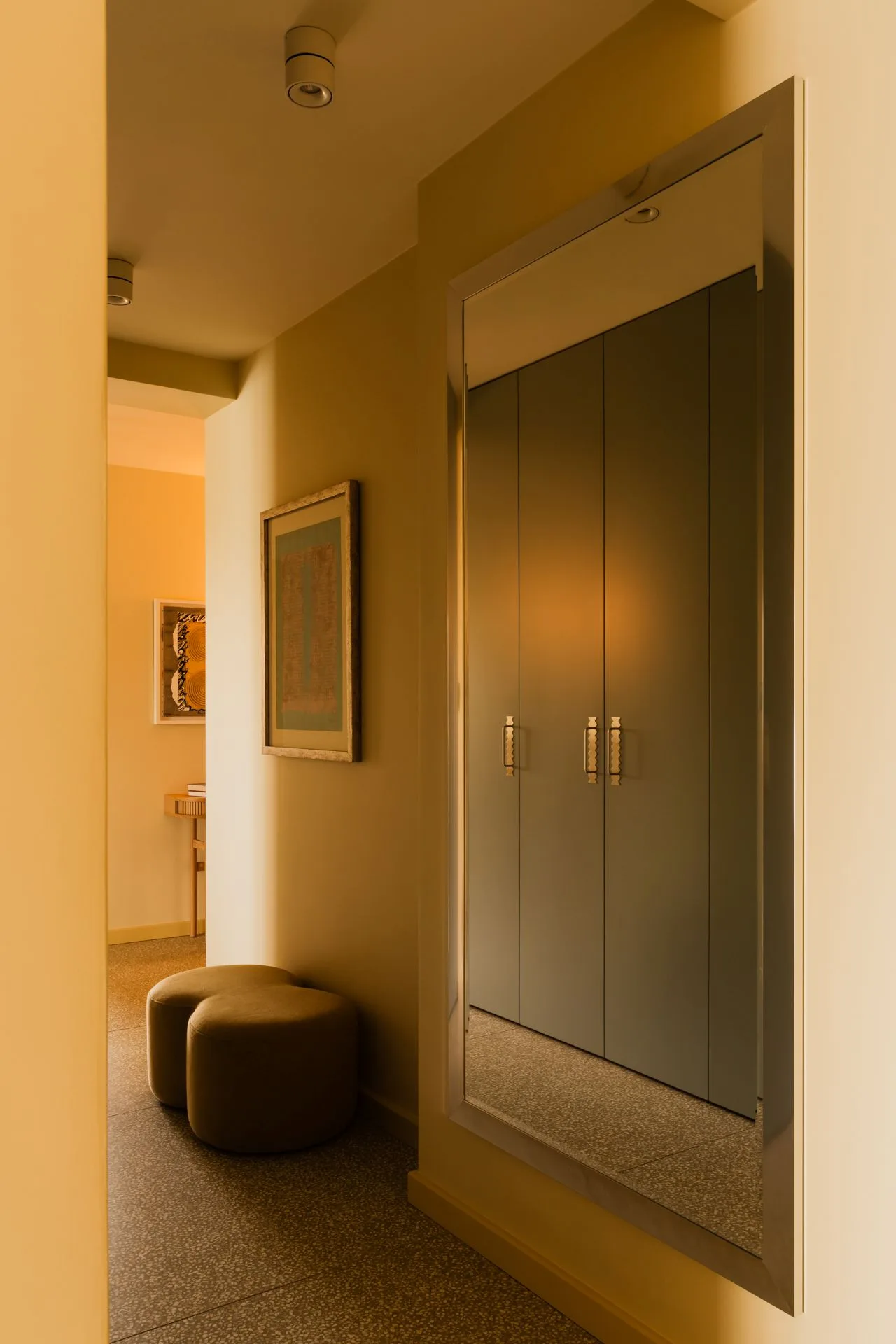 W tym wnętrzu kolor nie jest dodatkiem – jest językiem opowieści. W projekcie tego przedpokoju kluczowy jest szalenie modny masełkowy odcień, który stał się pięknym, aczkolwiek nieoczywistym tłem dla obrazów, mebli i światła, nadającego wnętrzu niezwykle malarski klimat.