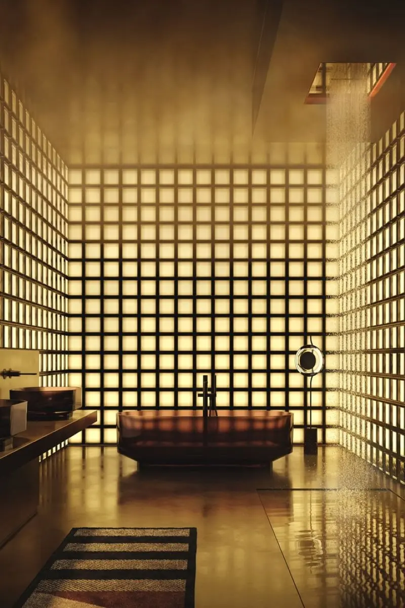 Szklane pustaki jako przepierzenie wydzielające strefy funkcjonalne, znalazły zastosowanie w koncepcji wnętrza autorstwa OBIEKTY STUDIO. Architekci zaproponowali takie rozwiązanie dla nowoczesnego i minimalistycznego wnętrza, gdzie tekstury i materiały odgrywają główną rolę.