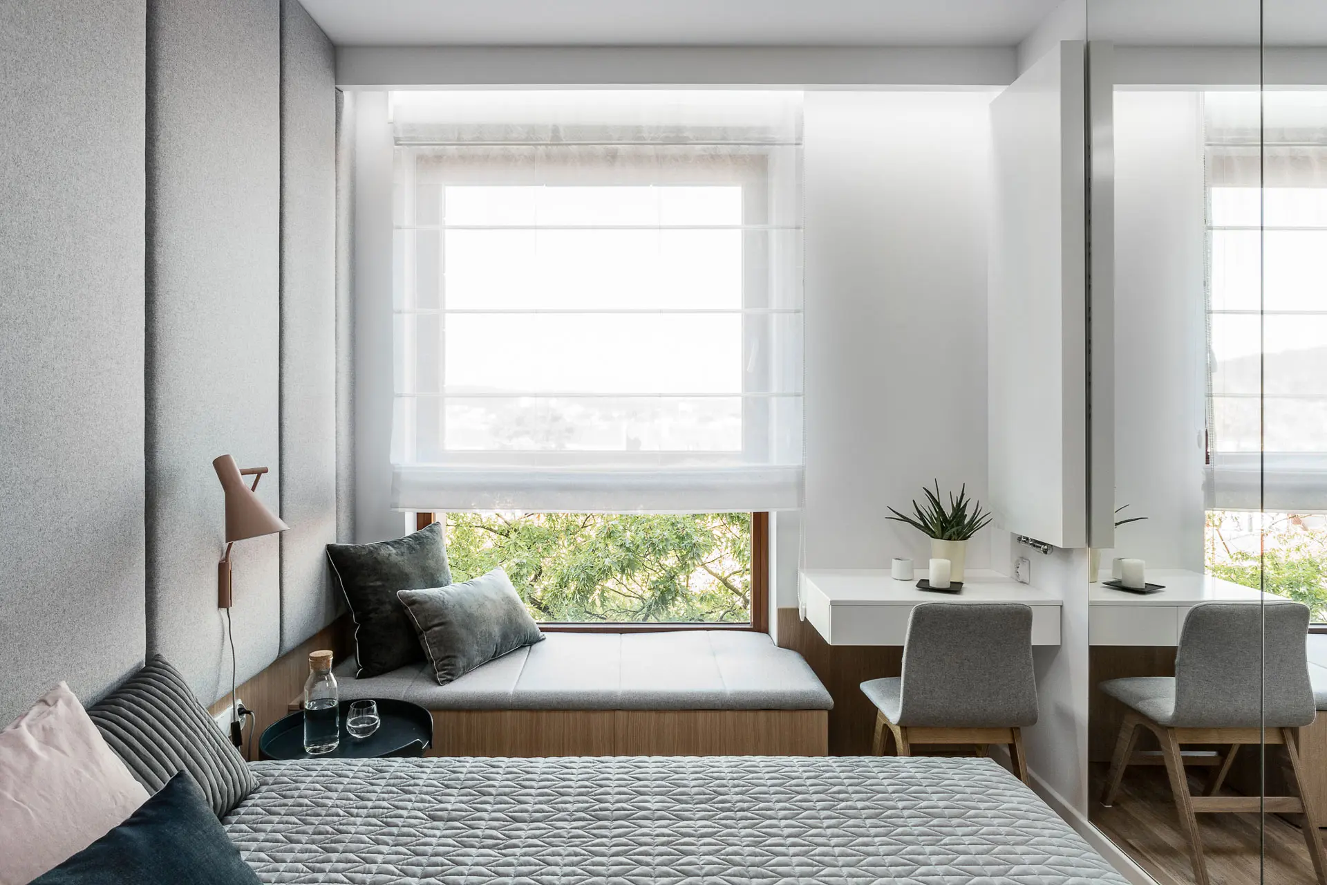 Pamiętajmy także o dekoracji okna, która sprawi, że pomieszczenie zyska nie tylko na przytulności, ale też spełni funkcję dekoracyjną oraz praktyczną. Możemy postawić na tradycyjne zasłony, shuttersy, drewniane żaluzje, rolety tradycyjne lub rzymskie. Całość dopełni odpowiednia aranżacja parapetu. Jeśli jest dosyć niski i szeroki, możemy wyczarować tam siedzisko – doskonałe do zatapiania się w ulubioną lekturę.