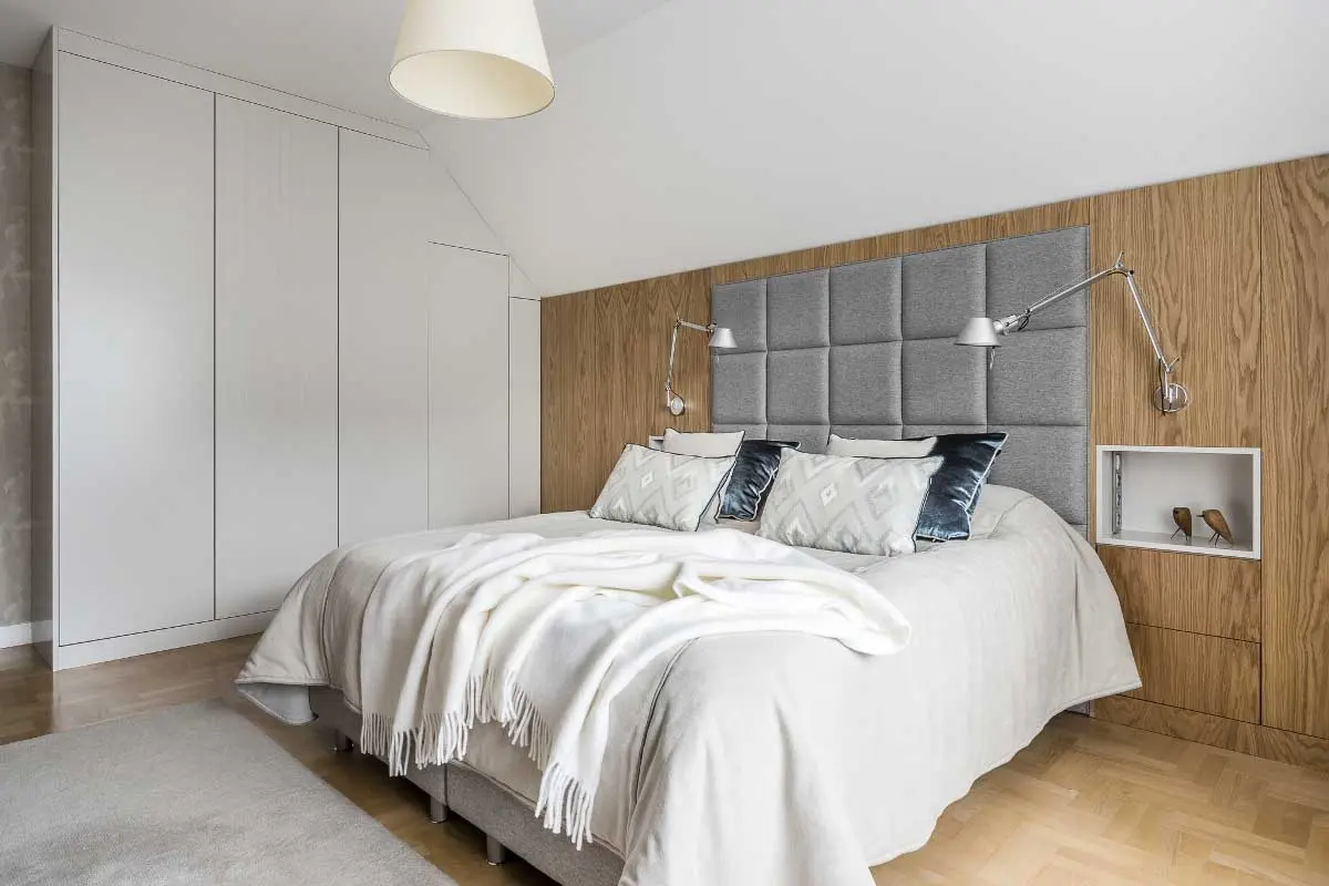 Drewno to jeden z głównych składników przepisu na przytulną sypialnię. Co ważne może pojawić się w aranżacji na wiele różnych sposobów. Po pierwsze oczywiście w formie desek podłogowych. Wybierając deski warstwowe, które znajdziesz w naszych showroomach, spokojnie możesz je zastosować na ogrzewanie podłogowe. Godną alternatywą dla drewna są panele winylowe, które – tak samo jak drewno – możesz ułożyć w jodełkę.