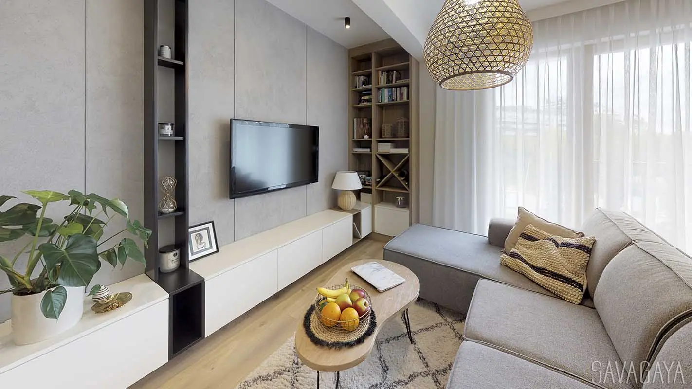 Salon ze ścianą betonową z elementami boho to kolejna ciekawa propozycja architekt z pracowni Savagaya. Jasne kolory, naturalne dodatki wspaniale współgrają z industrialną surową ścianą.