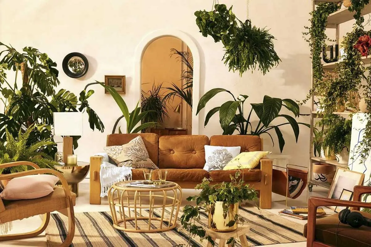 Jeśli chcemy zaakcentować styl afrykański w subtelny sposób, dobrym pomysłem jest wykreowanie domowej dżungli. Tworząc zielone kompozycje z bujnych roślin uzyskamy ciekawy efekt, szczególnie jeśli umieścimy je w plecionych osłonkach z rafii.