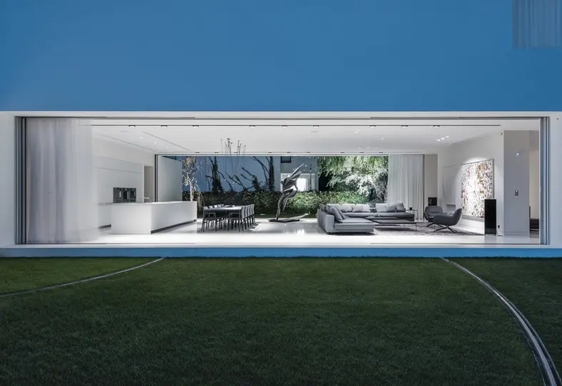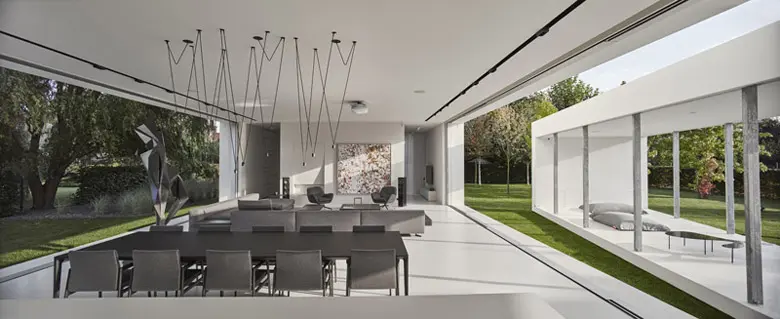 Dodatkowo, przy dobrej pogodzie, ale również wieczorami, gdy dom jest otwarty ruchomy element może stać się przedłużeniem strefy dziennej bądź też SPA. Biały kolor dominuje we wnętrzu – na posadzkach została zastosowana biała żywica epoksydowa.