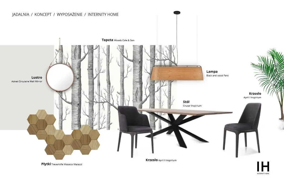 Zestawienie tapety ilustrującej las z heksagonalnymi płytkami imitującymi drewno to niebanalny koncept na jadalnię lokującą się gdzieś pomiędzy stylem skandynawskim a classic modern.