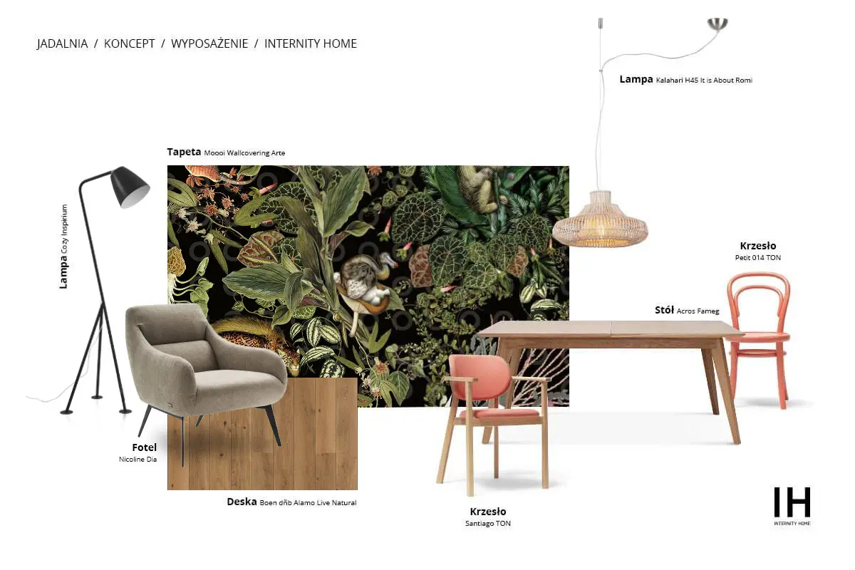 Odpowiednio dobrana tapeta potrafi stworzyć całe wnętrze. Tak niewątpliwie jest w przypadku poniższej aranżacji jadalni. Mocny botaniczny wzór to najnowsza propozycja marki Arte. Sprowokował mnie on do stworzenie pełnej stylizacji, która mocno lubuje się w naturalnych rozwiązaniach i jednocześnie jest zgodna z obowiązującymi trendami.