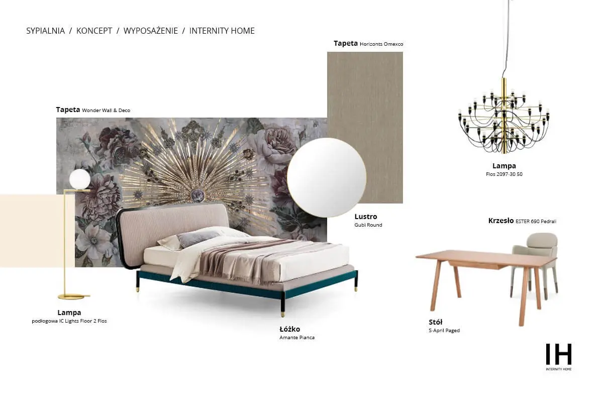Piękna, jednocześnie romantyczna i delikatnie psychodeliczna tapeta stworzona dla Wall & Deco przez kobietę – Evę Germani. Stwierdziłam, że to doskonały wzór do sypialni – oazy intymności. Dobrałam do niej łóżko włoskiej manufaktury, drewniane biurko i krzesło o niezwykle wysublimowanym designie. Stylizację ocieplają złote detale w postaci ramy okrągłego lustra, podstawy lampy z kultowej serii marki Flos a także okazałego żyrandolu sympatyzującego z klasycznym wzornictwem. Pozostałe ściany postanowiłam pokryć również tapetą, której głównym zadaniem jest stworzenie przytulnego klimatu, a także poprawa akustyki – w tym celu najlepiej sprawdza się tapeta tekstylna.
