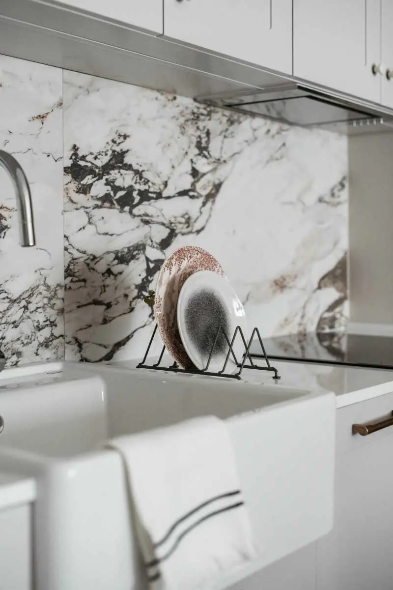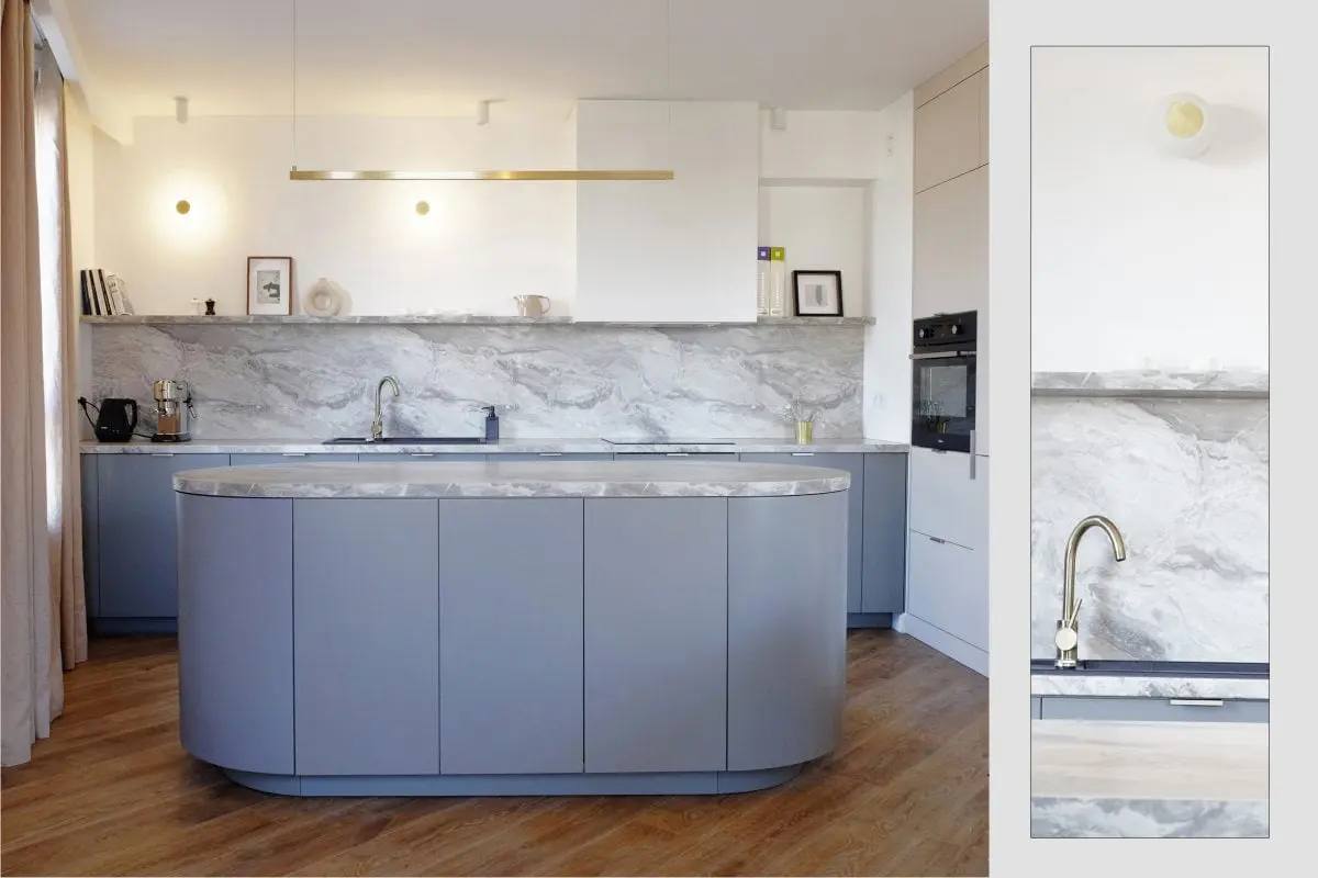 Marmur cieszy się niesłabnącą popularnością od wielu lat. Tekstura tego kamienia zdobi wnętrza urządzone w różnych stylach – od klasyki, aż po nowoczesne aranżacje w klimacie minimalistycznym, glamour, scandi czy modnego eklektyzmu. Jednak użycie naturalnego marmuru, w miejscach takich jak kuchnia, nie jest najlepszym wyborem. Porowatość materiału powoduje, że chłonie wszelkie płyny i szybko się odbarwia. Natomiast płytki oraz spieki wielkoformatowe są wyjątkowo odporne nie tylko na zabrudzenia, ale i na czynniki mechaniczne. Jednocześnie cała gama wzorów i kolorów pozwala na idealne dopasowanie tekstury do projektu.