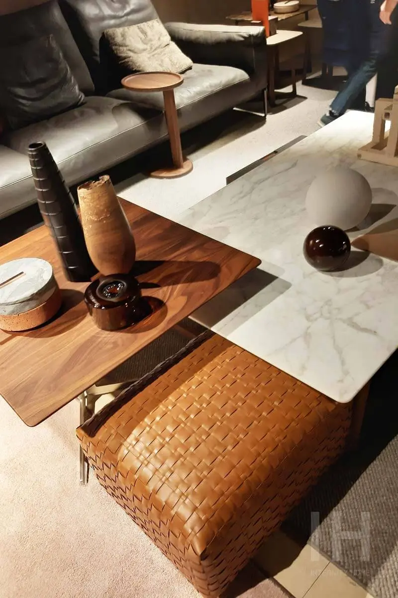 Ważnym trendem, o którym warto wspomnieć, jest łączenie ze sobą różnych (z pozoru niepasujących) materiałów. W ramach jednego mebla często występowała, na przykład skórzana plecionka i drewno, albo marmur i metal. Stylowe miksy występowały również na poziomie łączenia ze sobą różnych elementów, tworzących w efekcie niebanalne, modułowe kompozycje. Dobrym przykładem takiego działania jest zachodzący na puf stolik pomocnik i do tego podnóżek (najlepiej gdyby każdy z elementów był wykonany z innego surowca).