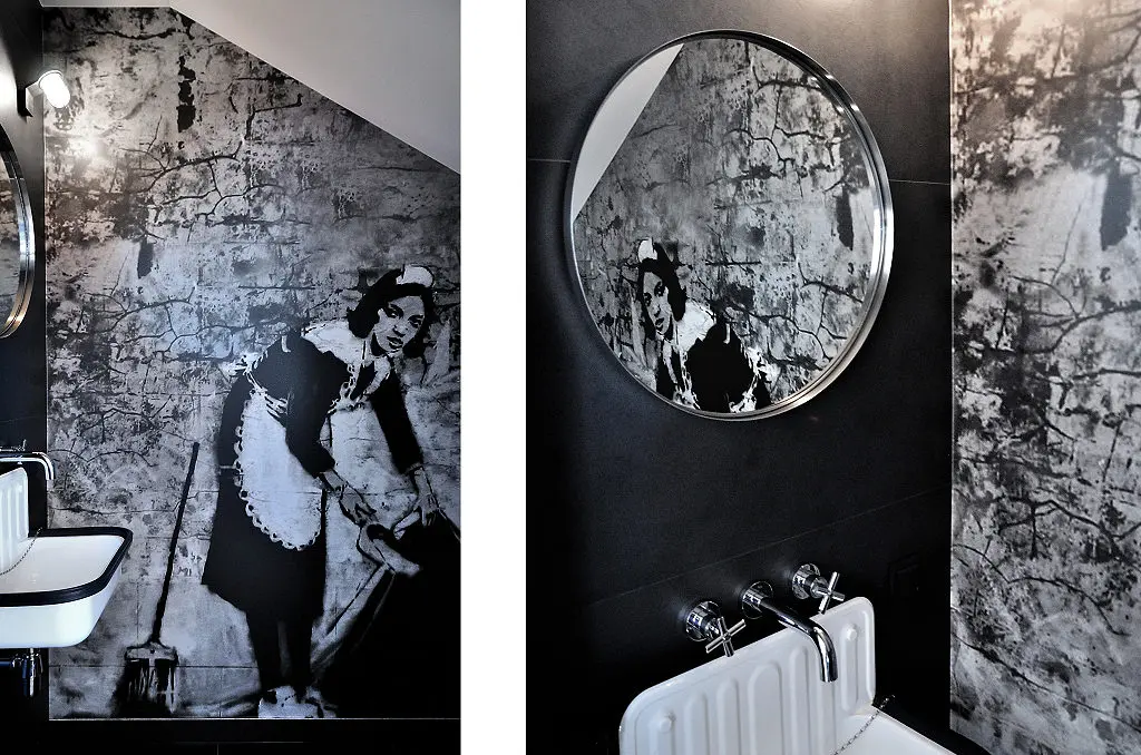 Poniżej mam dla Was projekt łazienki biura architektonicznego MSWW, właśnie z motywem street art Banksy’ego w roli głównej.