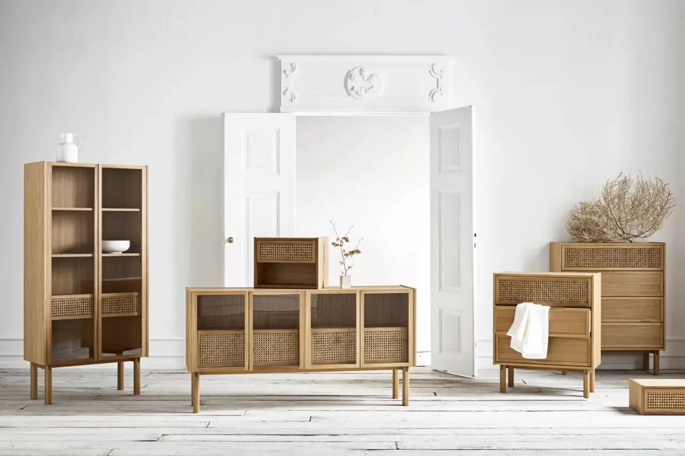Komoda z plecionką wiedeńską na froncie w salonie w stylu japandi