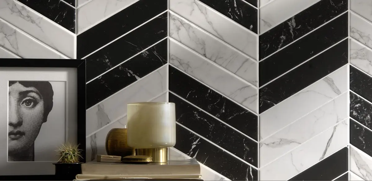 Płytki ułożone w jodełkę od Tonalite (marka dostępna w naszych showroomach)
