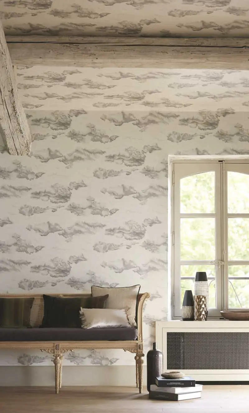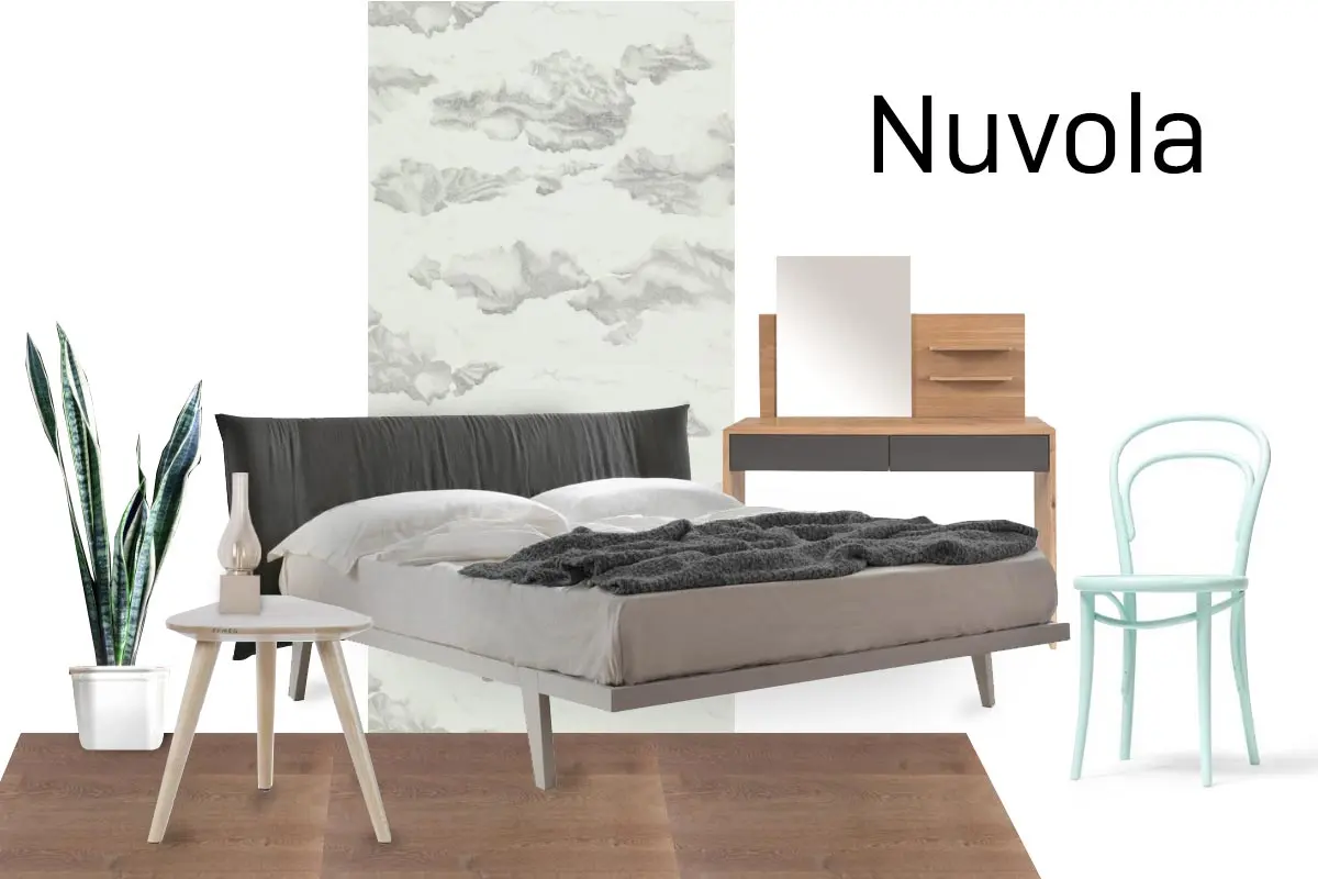 Sypialnia to miejsce, w którym relaksujemy się po ciężkim dniu pracy, dlatego ważne jest by panowała w niej atmosfera spokoju. Tapeta Nuvola z motywem chmur, wprowadzi do wnętrza subtelny motyw dekoracyjny. Wystarczy pas umieszczony za łóżkiem, krzesło w delikatnym kolorze i kilka zielonych roślin, by odmienić pomieszczenie.