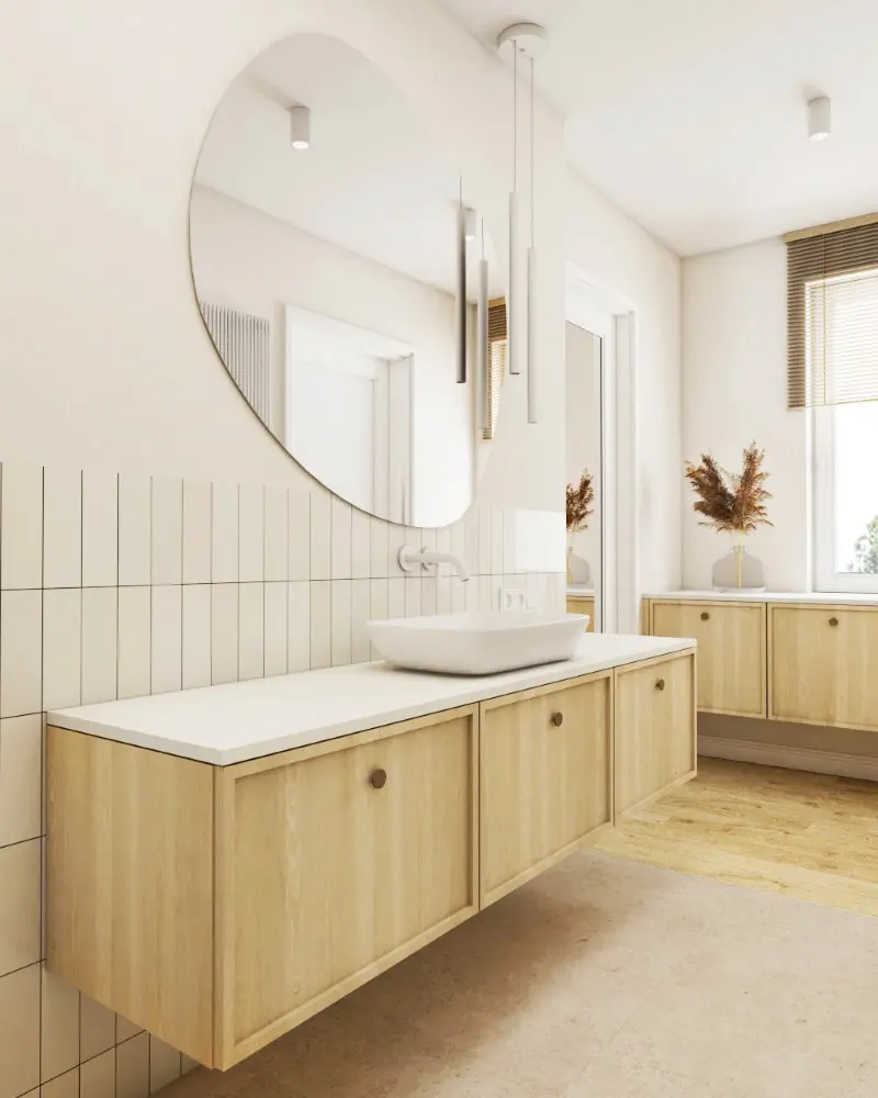 To zgrabna, przyciągająca wzrok sztuczka, dzięki której każde pomieszczenie będzie wyjątkowe! Kontrast nie tylko doda beżowemu wnętrzu charakteru, ale też sprawi, że stanie się jeszcze bardziej designerskie. Pamiętajcie tylko o tym, aby nie przesadzić. To beże mają odgrywać główną rolę, czerń ma stanowić jedynie dopełniające akcenty. Doskonały przykład znajdziecie w poniższym projekcie łazienki, gdzie beżowy total look przełamuje czarna bateria wannowa.
