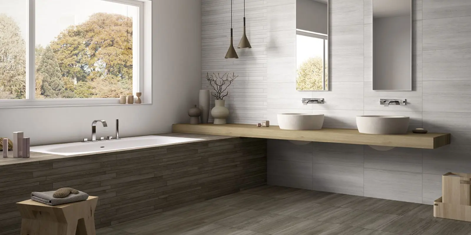 Kolejny trend jest idealnym rozwiązaniem dla fanów nieśmiertelnej klasyki. Szara łazienka i ta w odcieniach beżu? Taki efekt otrzymamy wybierając modne płytki imitujące beton lub drewnopodobne. Nie dość, że zbliżają nas to kolorystyki łazienek, które w tym momencie są najczęściej wybierane, to taki zabieg znacznie zbliża nas do naturalnych rozwiązań. Szarą łazienkę przełamiemy drewnem i roślinnością, na przykład modną monsterą (nie musimy od razu decydować się na prawdziwą roślinę, wystarczy postawić stylowy wazon i włożyć do niego gałązkę z ,,dziurawym” liściem”). Łazienka wyłożona płytkami drewnopodobnymi idealnie koresponduje z bielą i prawdziwym drewnem.