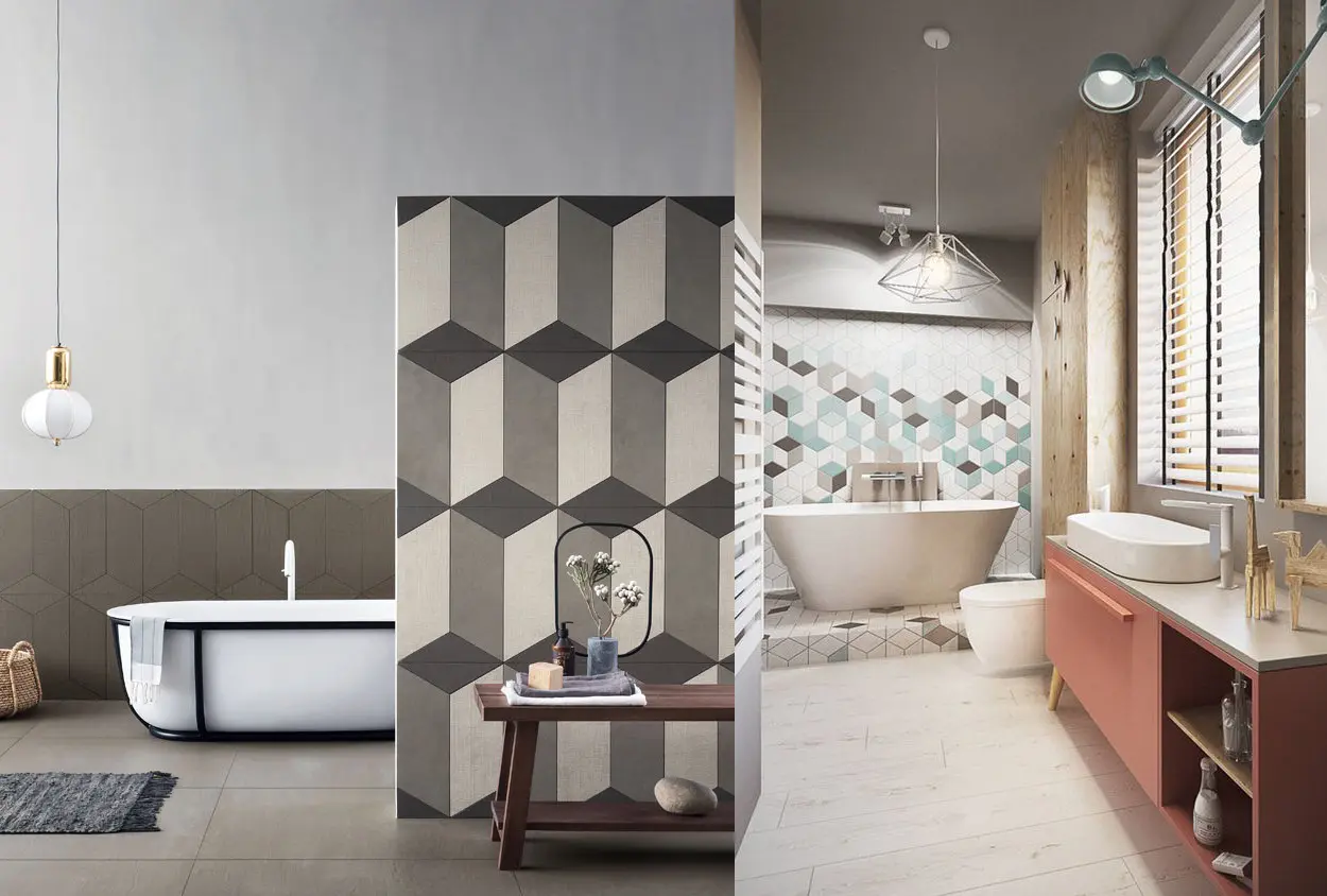 Geometryczne kształty na płytkach to ciekawy trend. Kanciaste płytki ułożone w różne wzory pozwalają na wydobycie z wnętrza tego, co najlepsze. Najlepiej sprawdzają się w nowoczesnych łazienkach, w których design wysuwa się na pierwszy plan.