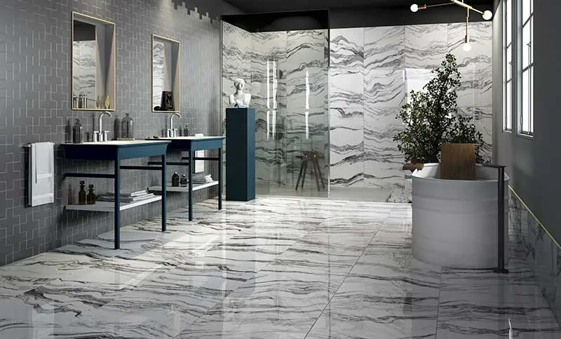 Jeśli zależy nam na łazience, która będzie kojarzyła się z luksusowymi i prestiżowymi wnętrzami, powinniśmy zdecydować się na płytki imitujące kamień, najlepiej marmur. Choć jeszcze do niedawna ten materiał był kojarzony przede wszystkim z bogatymi rezydencjami i dworami, to w tej chwili coraz częściej pojawia się w naszych domach, będąc luksusowym dopełnieniem wystroju wnętrza. Musicie wiedzieć, że teraz wszystko, co ma chociaż namiastkę tego deseniu, jest okrzyknięte prawdziwym „must have”, dlatego warto zdecydować się na ten wzór chociażby na płytkach, czyniąc tym samym naszą łazienkę prawdziwą oazą piękna i elegancji. Jeśli trend na marmurowe płytki jest Ci bliski, ale boisz się, że będzie czynił Twoje wnętrze chłodnym w odbiorze, przełam je detalami z drewna i złota, które znacznie ocieplą nasze cztery kąty.