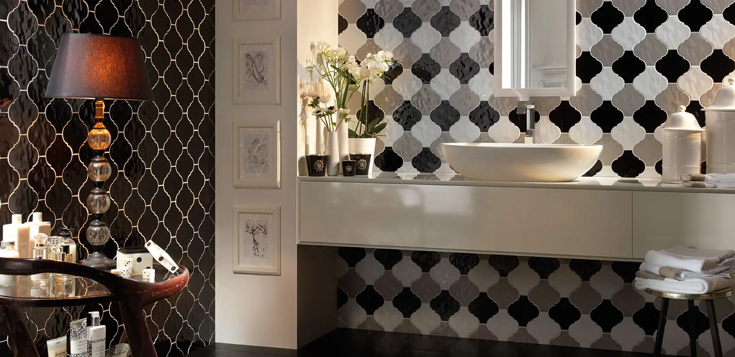 Przyszedł czas na arabeskę, która doskonale oddaje coraz bardziej obecny we wnętrzach marokański styl. Inspirowanie się kulturą Orientu w aranżacji mieszkań, to jeden z największych trendów, a arabeski idealnie wpisują się w tę modę. Moim zdaniem takie płytki idealnie wyglądają w towarzystwie tropikalnych roślin, rattanu, wikliny i mebli kolonialnych. Jeśli chcesz odbywać wnętrzarską podróż w stronę Orientu, przy każdym przekroczeniu progu łazienki, arabeskę uzupełnij modnym dywanem kilim.