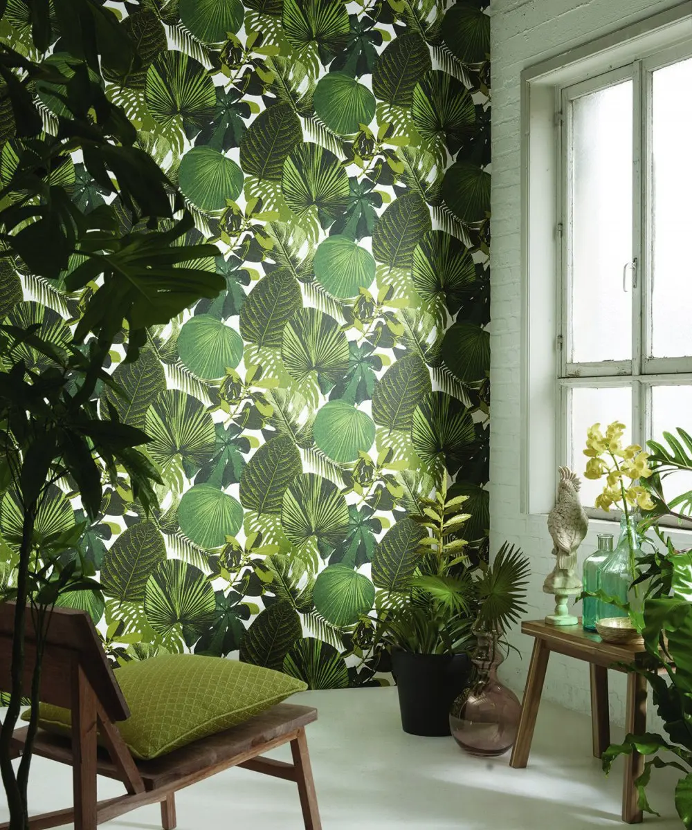 Liście palmowe, te z drzew bananowca i wszystkie inne charakteryzujące ciepłe i wilgotne lasy równikowe będą z pewnością numer jeden tego sezonu. Świetnym sposobem na wprowadzenie ich do wnętrza jest wybór modelu tapety, który w swoim wzorze będzie miał grafiki właśnie tych roślin. Nie muszą być one odwzorowane jeden do jednego. Jeśli nie chcecie, by podobna dekoracja była zbyt silnym akcentem, wybierzcie delikatniejsze kolory, łagodniejsze barwy i nie kładźcie tapety na całej powierzchni ściany.