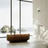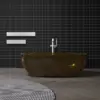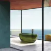 Bardziej awangardową formę przyjmuje transparentna wanna z kolekcji Borghi, również wykonana z Cristalmood. Wyrazisty kształt nieco zwężony od dołu, sprawia że jest absolutnym bohaterem przestrzeni, wokół którego można zbudować całą aranżację.