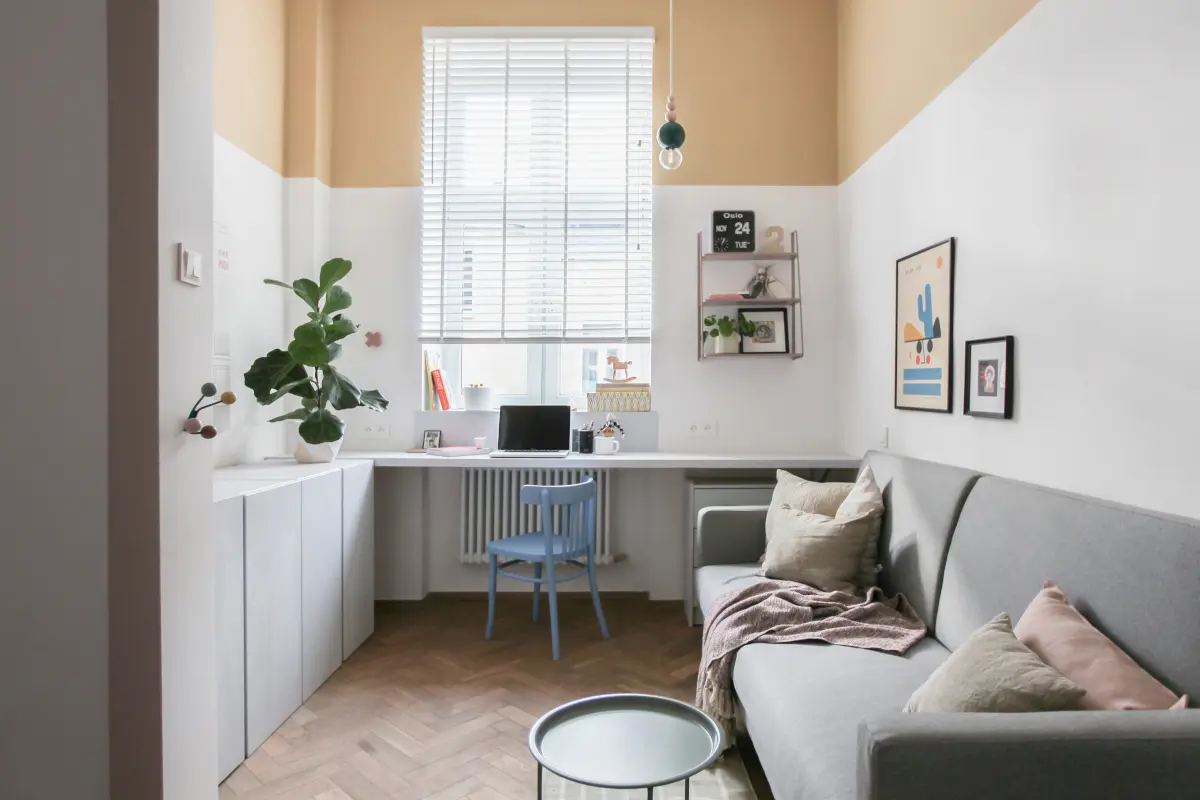 Aby wysokie małe wnętrze nie przypominało studni, fajnie jest pomalować ściany na dwa kolory. Projektantki z Morr Studio zastosowały ten trik w projekcie mieszkania o metrażu 22 m2. Biel, która stanowi podstawę wszystkich ich projektów pojawiła się na ścianach części dziennej, nieco wyżej zastosowały beż. Tym sposobem, udało się optycznie obniżyć wnętrze, które zyskało odpowiednie proporcje.